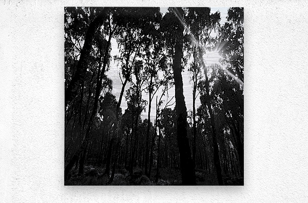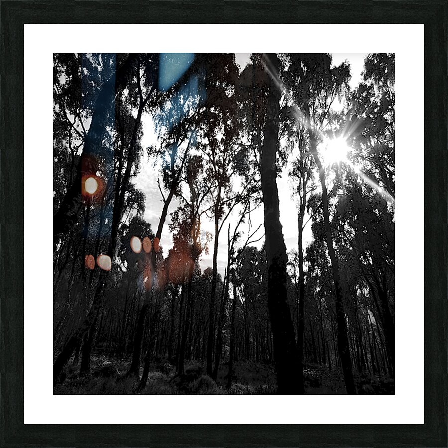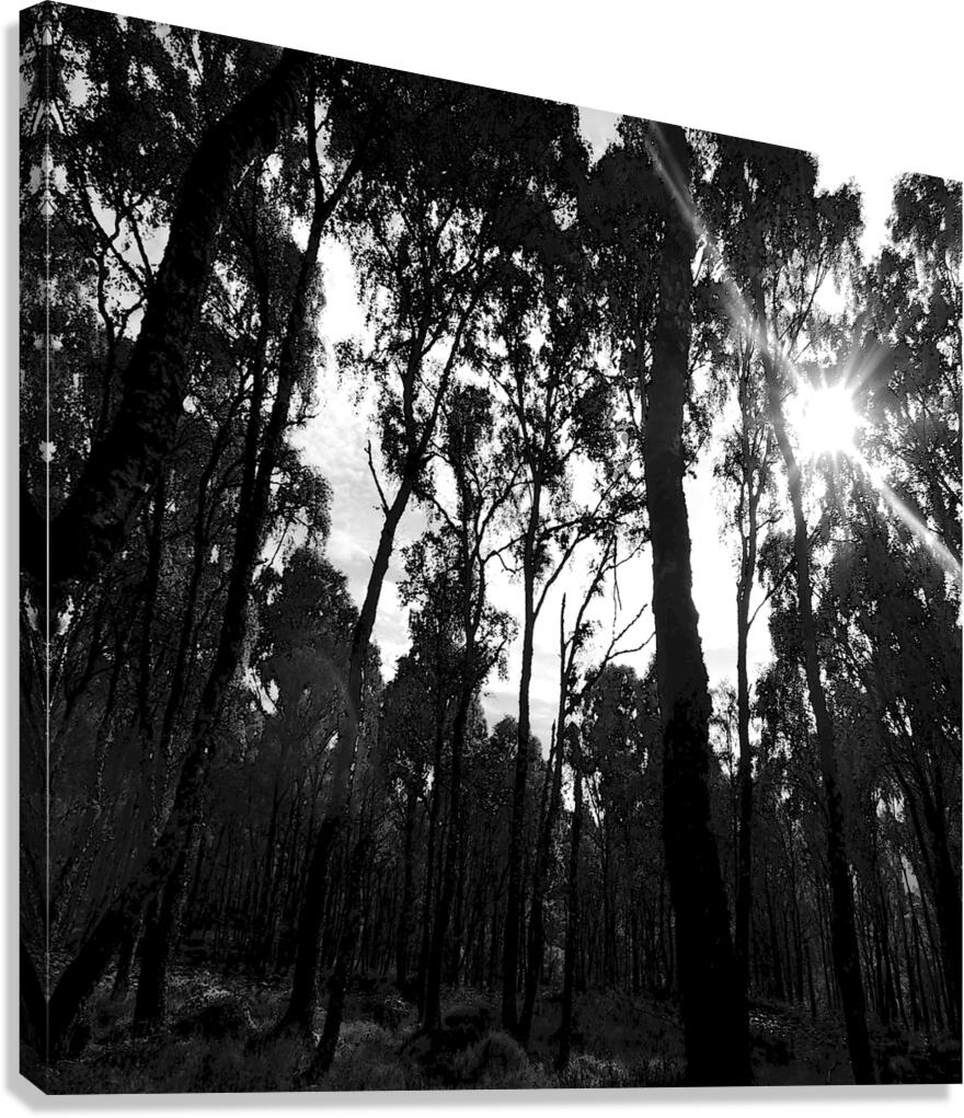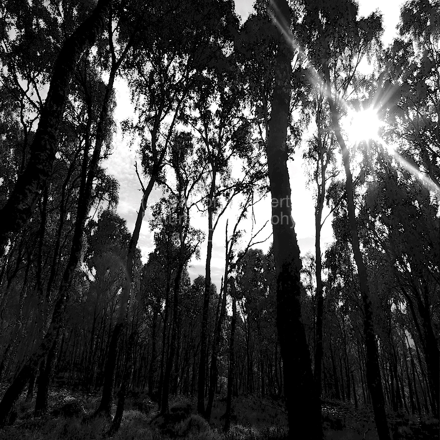 I originally took this photo in High Contrast Black and White, during a lovely sunny nature walk through the Scottish Highlands. Laterally digitally manipulating it into a stunning piece of contemporary nature art. Features tall Birch trees reaching towards the sky, their silhouettes contrasted against a bright sun peeking through the branches. Sunlight filters through the canopy, casting gentle shadows on the forest floor.