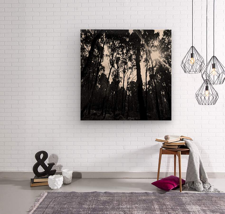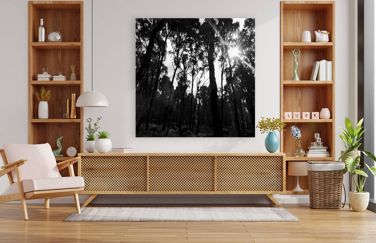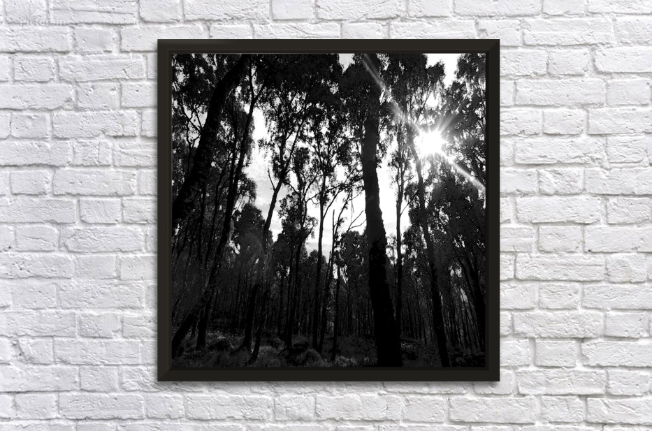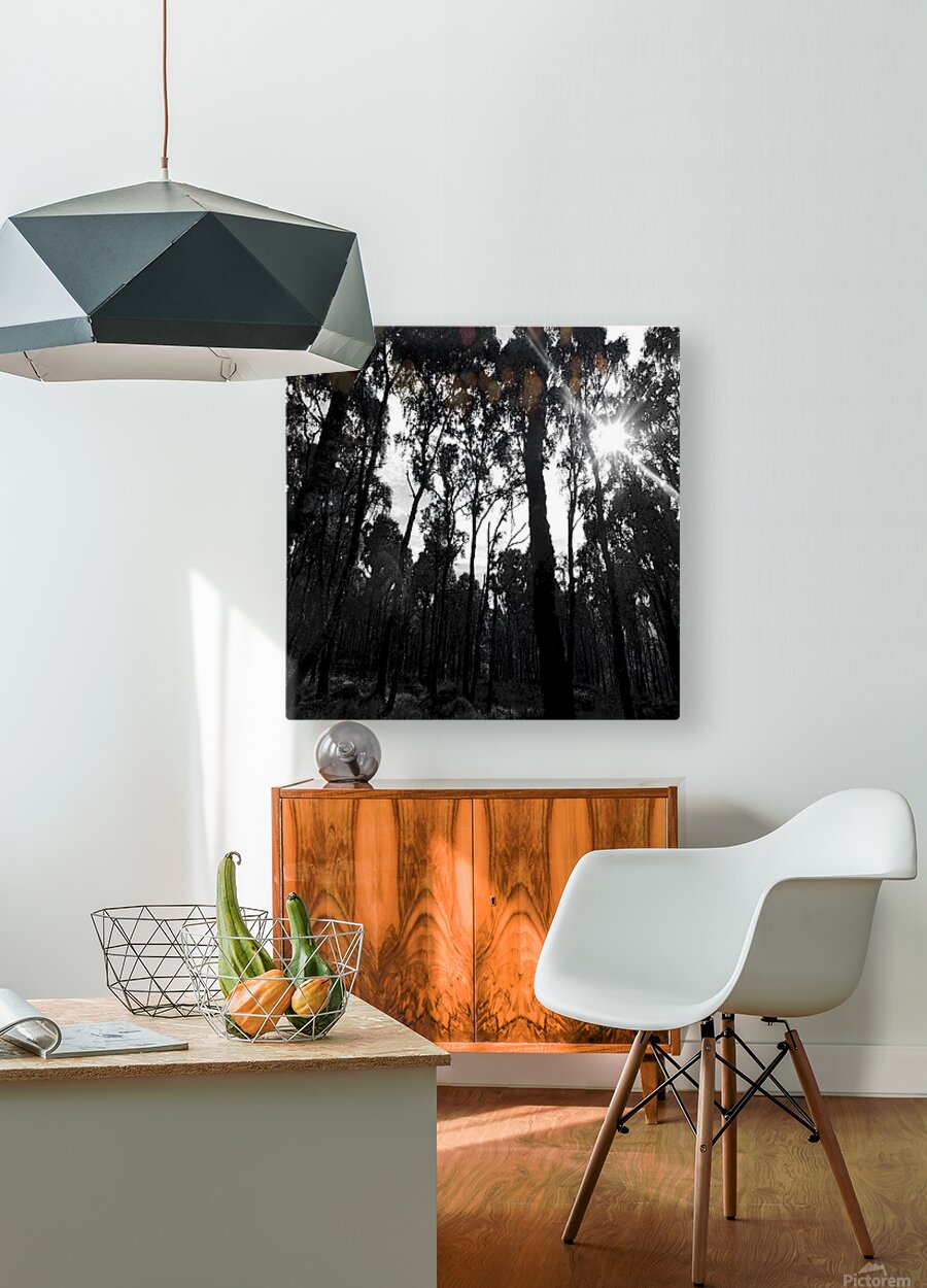 I originally took this photo in High Contrast Black and White, during a lovely sunny nature walk through the Scottish Highlands. Laterally digitally manipulating it into a stunning piece of contemporary nature art. Features tall Birch trees reaching towards the sky, their silhouettes contrasted against a bright sun peeking through the branches. Sunlight filters through the canopy, casting gentle shadows on the forest floor.