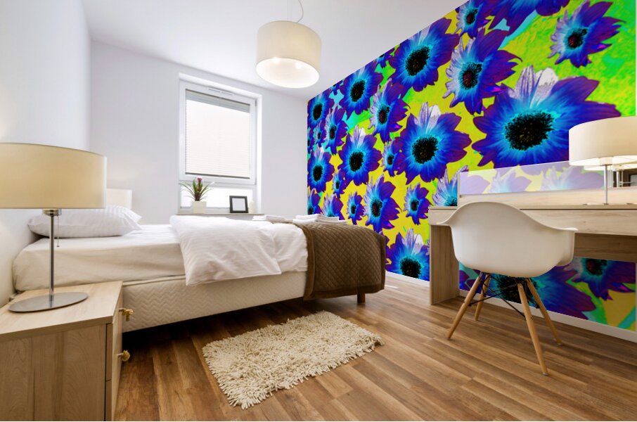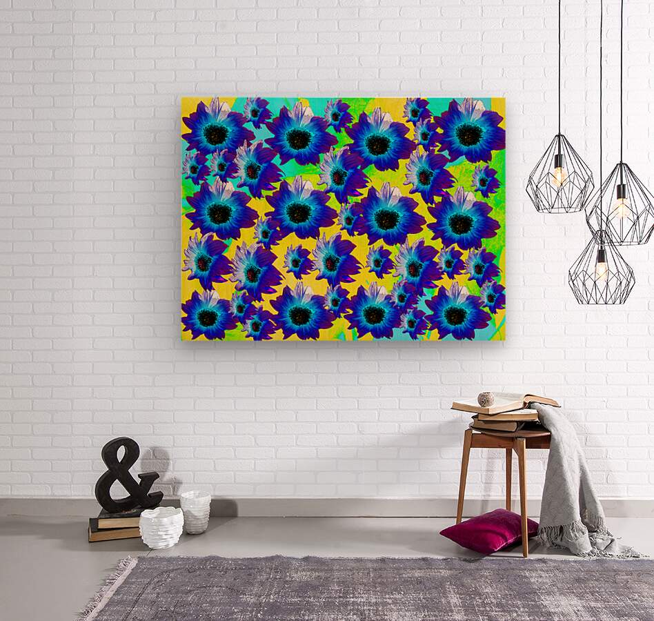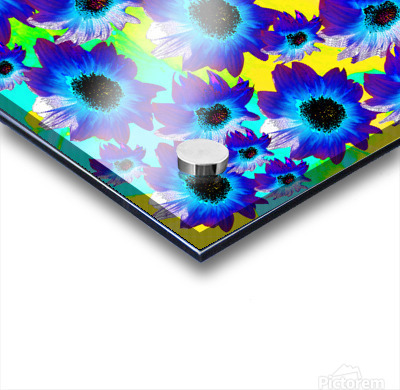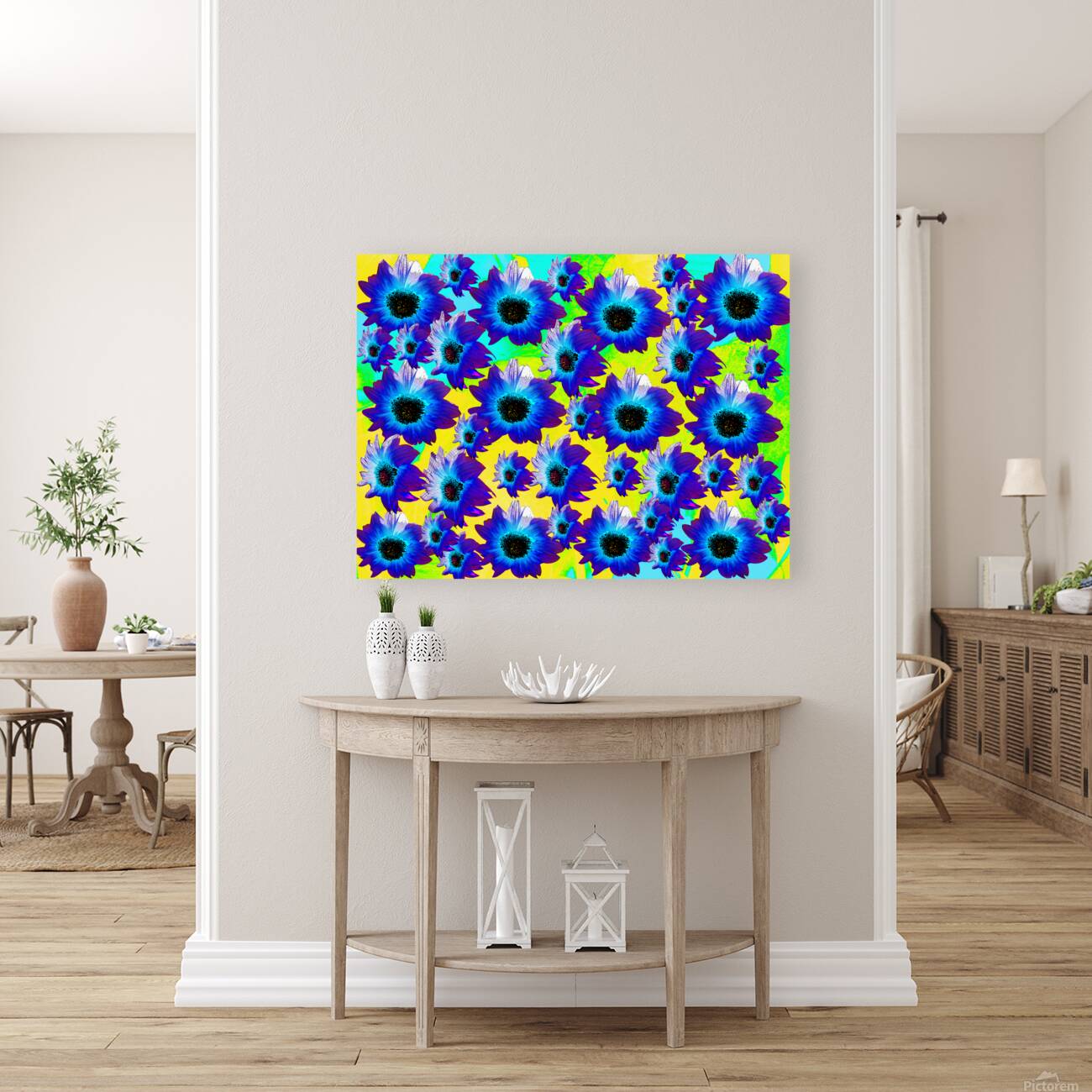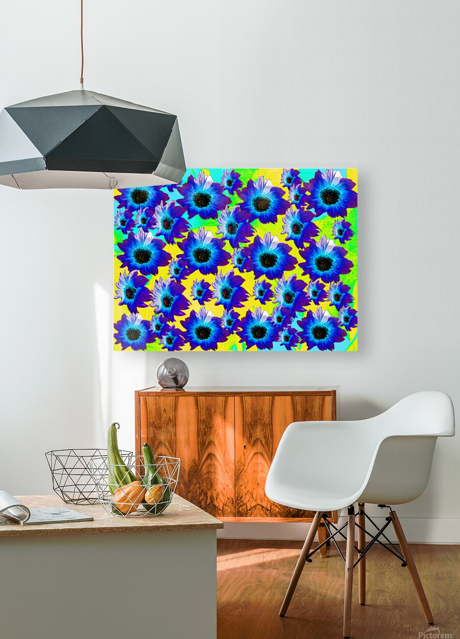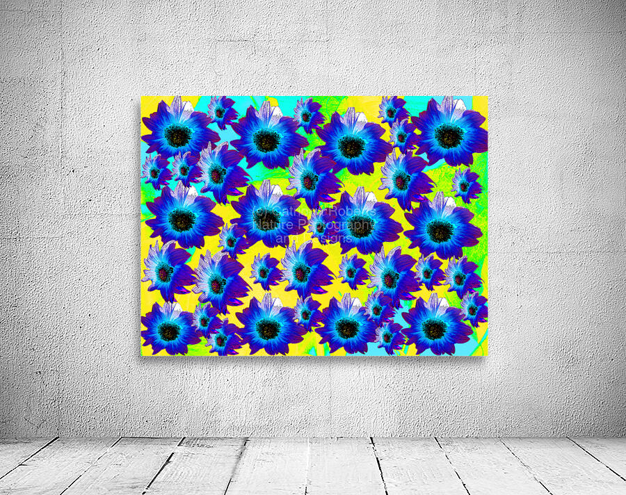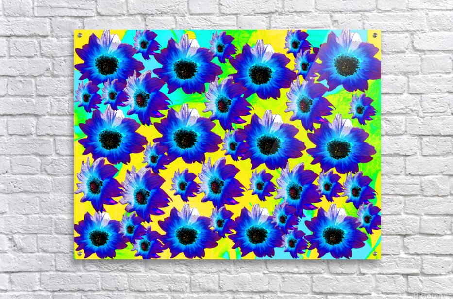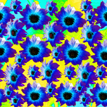 Once a close up photo of Sunflowers and a hand painted acrylic, laterally digitally manipulated using various means( including the AI Magic Grab in Canva.com). Now a plethora of vibrant blue flowers with dark centers floating on a bright background with yellow and green hues. The flowers forms a bold, distinct abstract pattern.