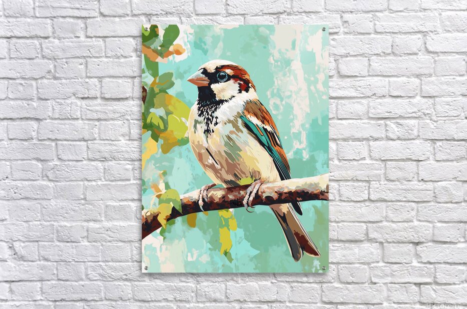 ABOUT THIS ARTWORK: A VINTAGE STYLE DRAWING OF A SMALL SPARROW SITTING ON A BRANCH