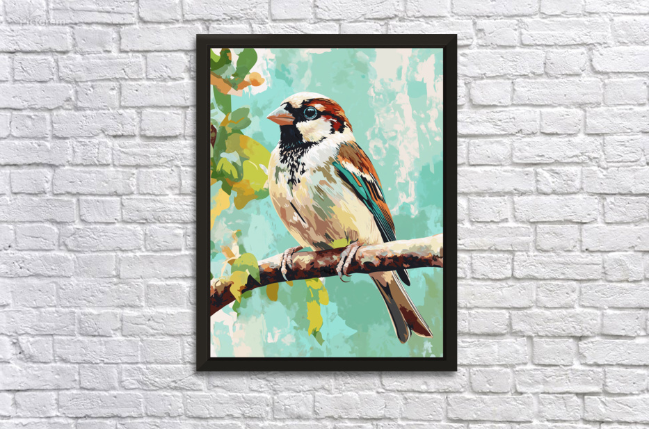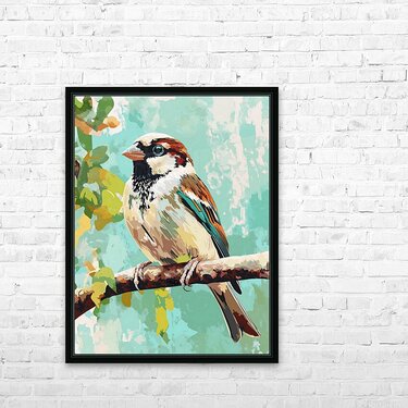 A vintage style drawing of a small sparrow sitting on a branch Wall Decor Frame