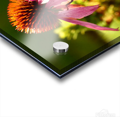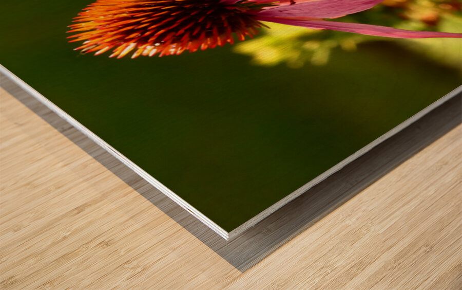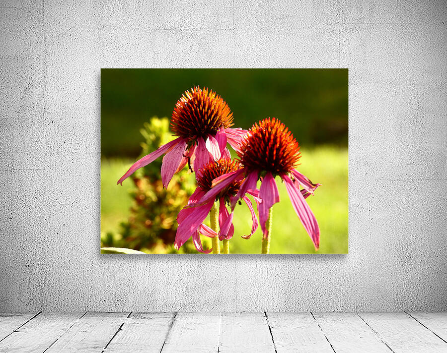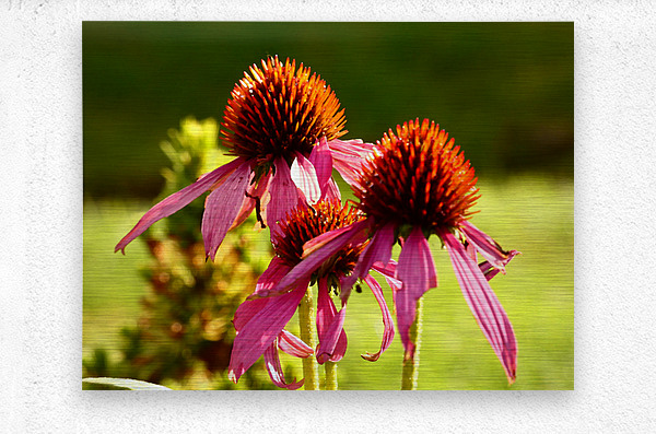 I took this photo on a lovely summer morning and laterally digitally manipulated it into a stunning piece of impressionistic floral art . Features vibrant pink coneflowers with spiky orange centers basking in bright sunlight against a soft, green background. The petals appear slightly wilted, giving a touch of natural imperfection to the scene.
