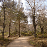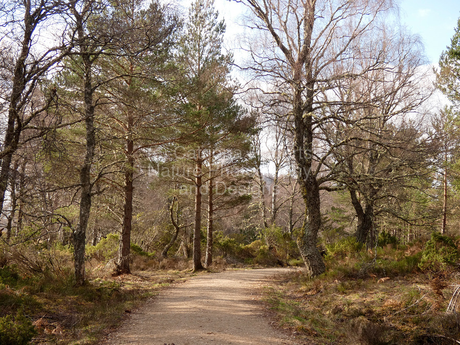I took this photo during a lovely winter nature walk through the Scottish Highlands. Features a winding dirt path meandering through a serene forest, flanked by tall, leafless trees and dense greenery. Sunlight filters gently through the branches, casting soft shadows on the ground.