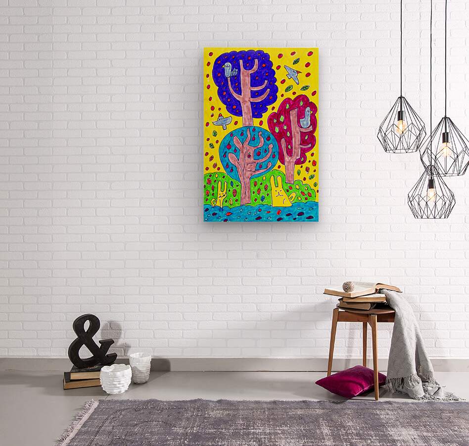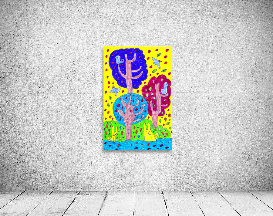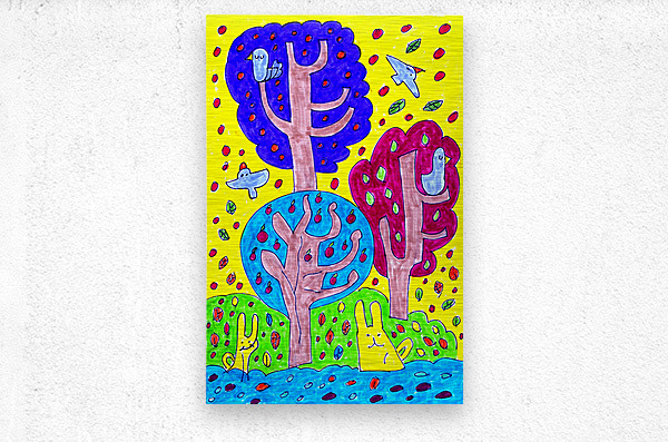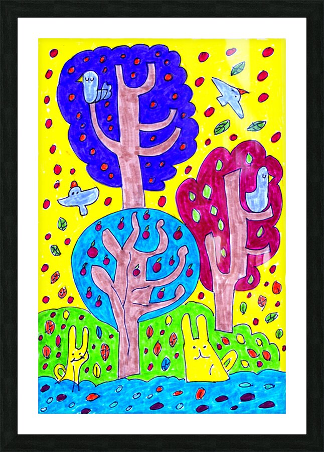 A hand drawn design created using coloured ink pens and paper. Features a whimsical scene depicting colorful trees with birds perched on their branches and playful rabbits on the ground. The background is vivid yellow with scattered leaves and red berries
