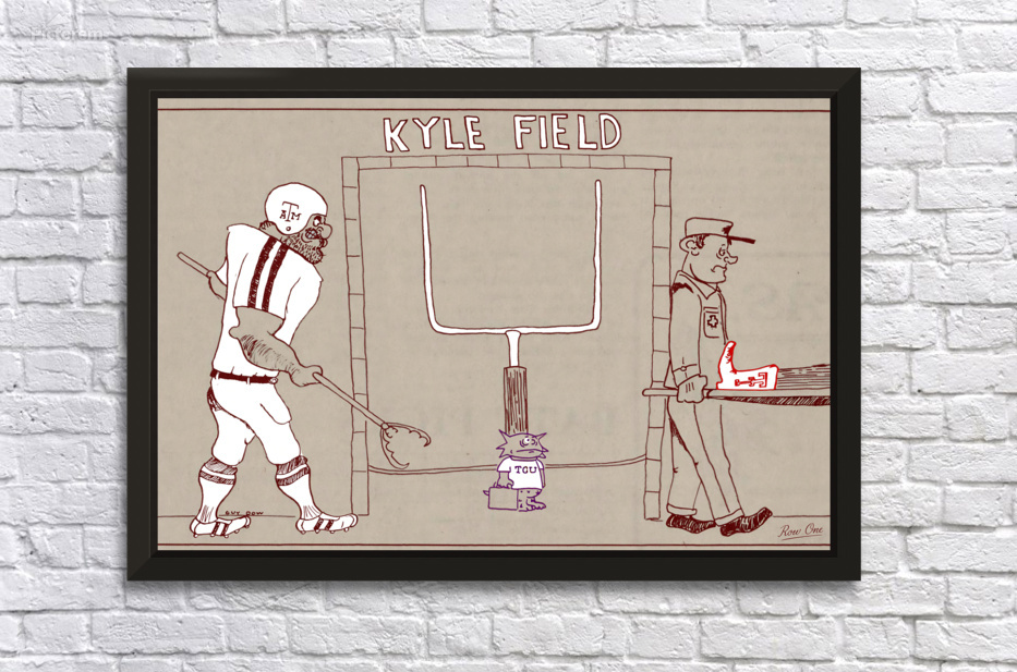 1970s Texas A&M Cartoon Art | Artist Guy Dow | Row One | Over 18,000 Historic Sports Prints | Remixed for aesthetics, this fantastic 1970s cartoon art is a funny work of art from the Southwest Conference Days. Derivative art © 2025 Row One Brand