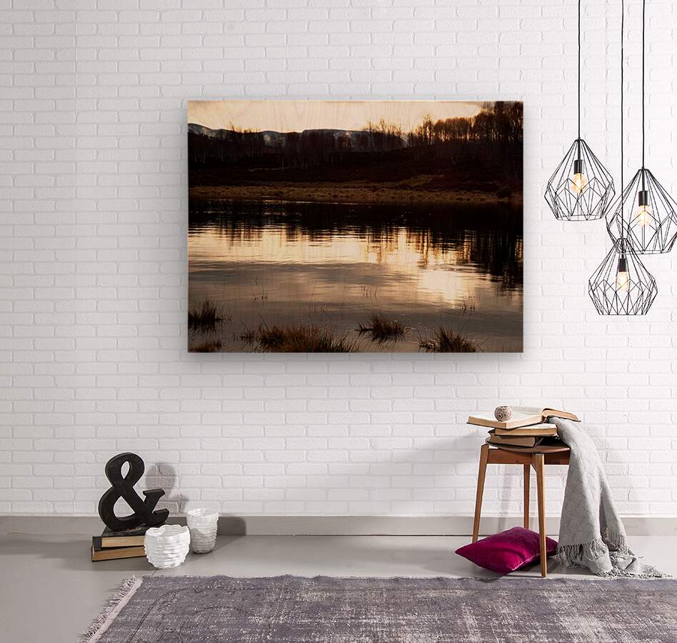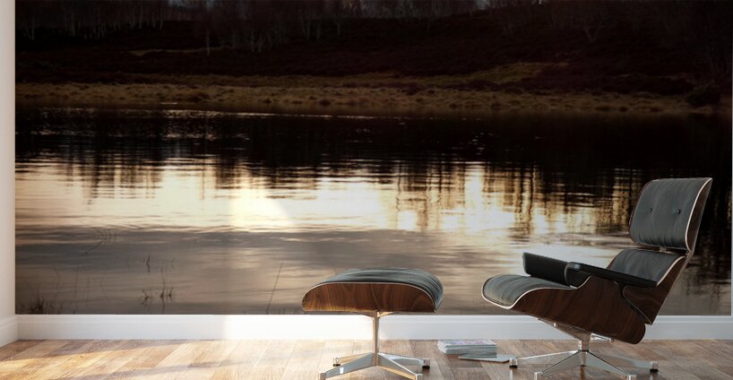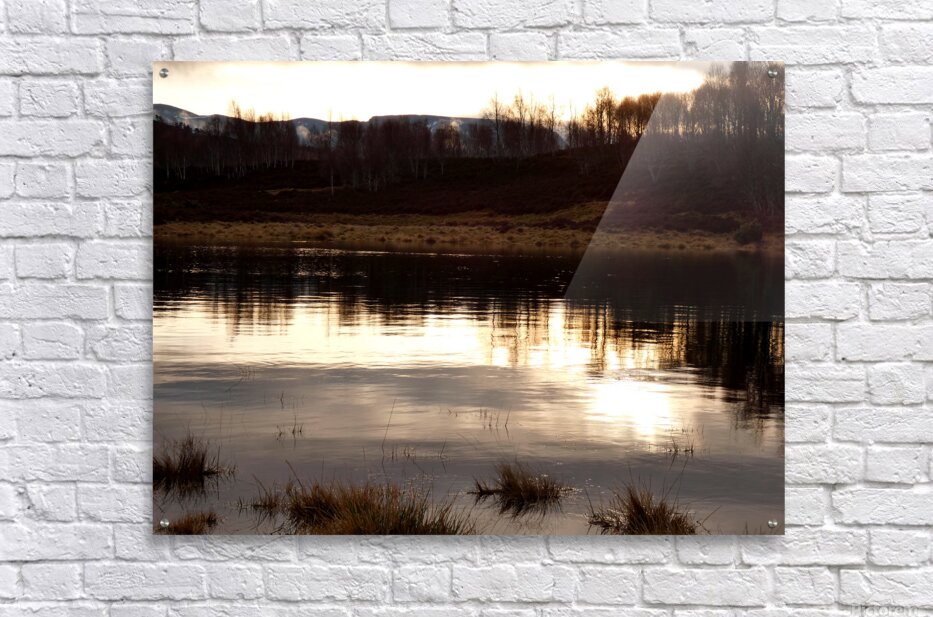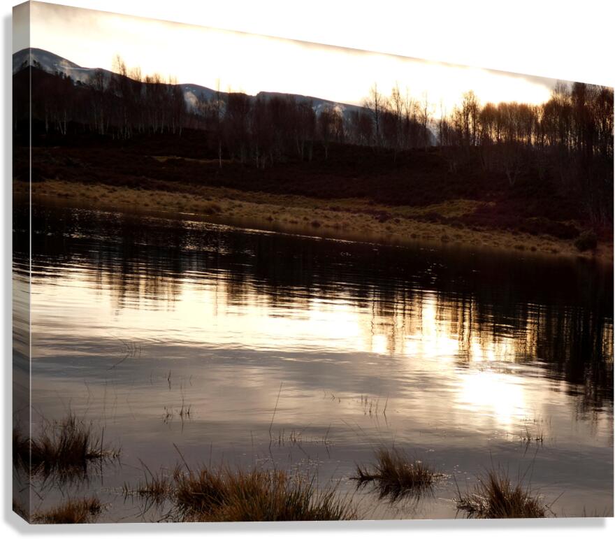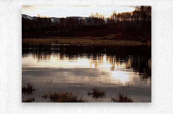 I took this photo during a lovely winter nature walk through the Scottish Highlands. Features sunlight softly illuminating the calm surface of a lake, reflecting silhouettes of distant trees and hills. In the foreground, tufts of grass emerge from the water, adding depth and texture to the serene landscape.