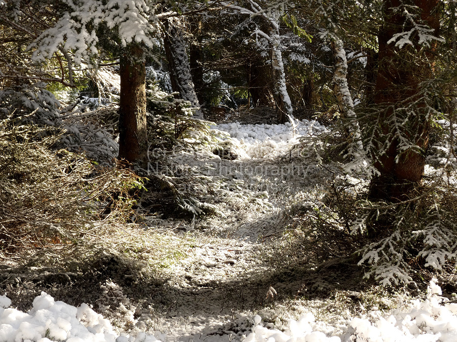 I took this photo during a lovely snowy nature walk through the Scottish Highlands. Features sunlight filtering through a dense Pine forest, highlight...[+]