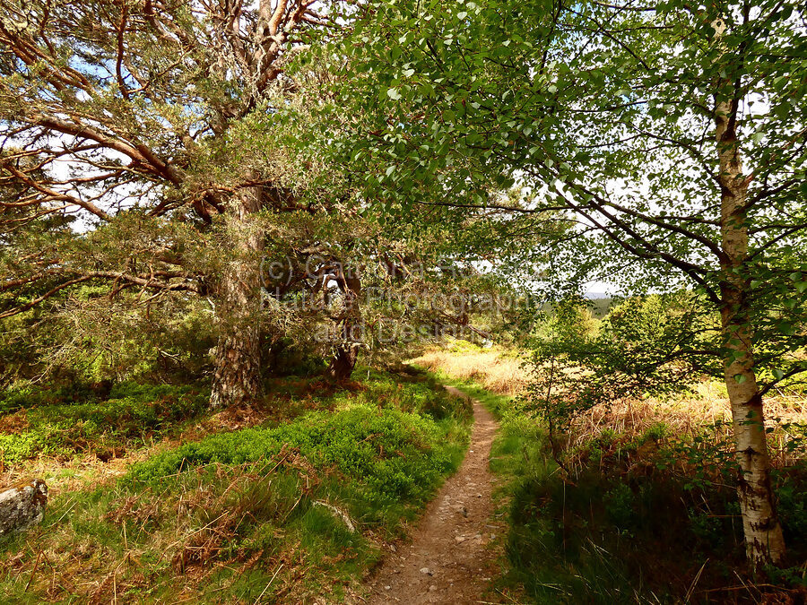 I took this photo during a lovely summer nature walk through the Scottish Highlands. Features a narrow dirt path winding through a lush forest, bordered by vibrant green foliage and tall Pine and Birch trees. Sunlight filters through the canopy, casting dappled shadows on the ground.