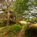 I took this photo during a lovely summer nature walk through the Scottish Highlands. Features a narrow dirt path winding through a lush forest, border...[+]