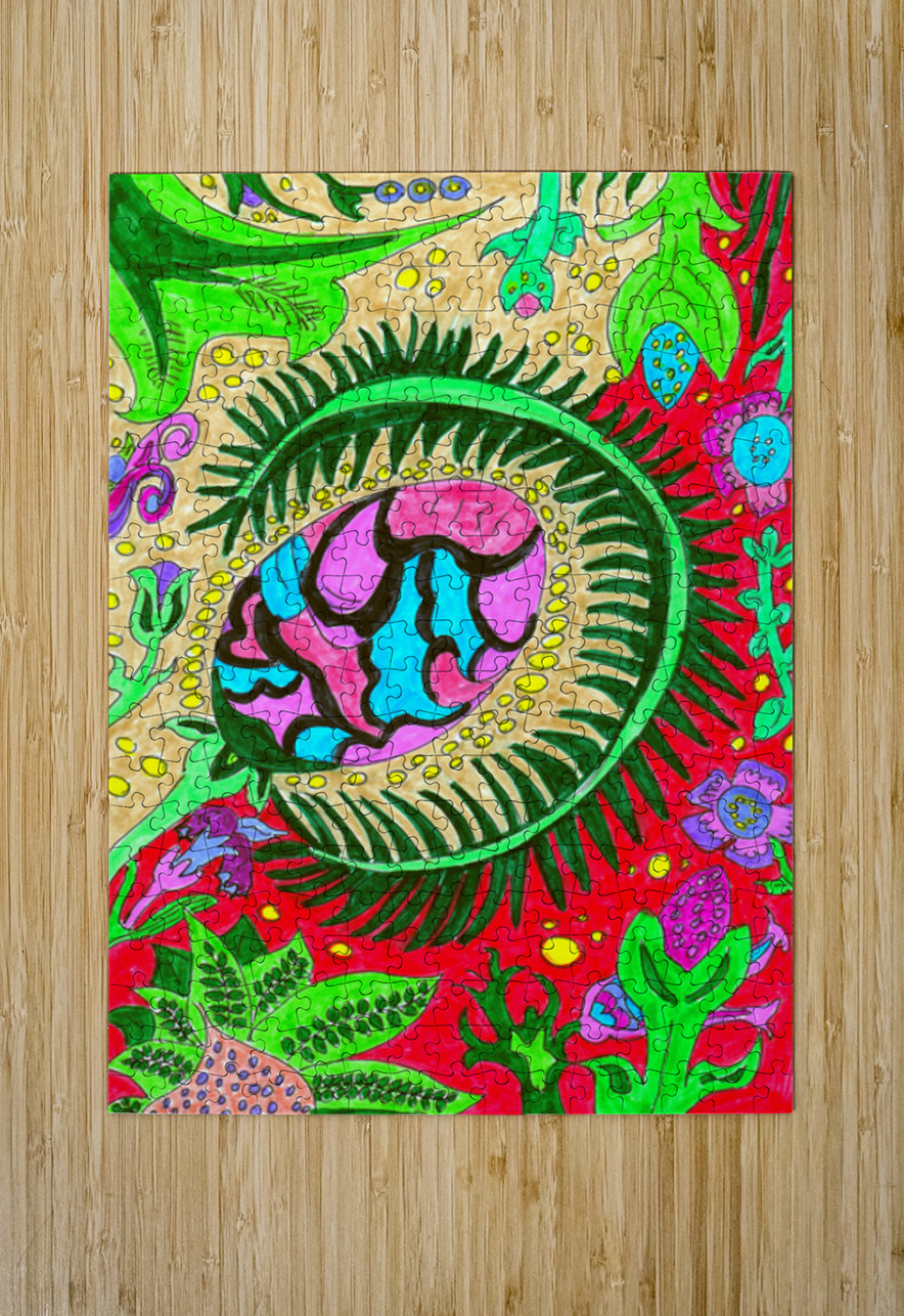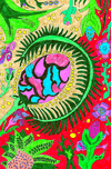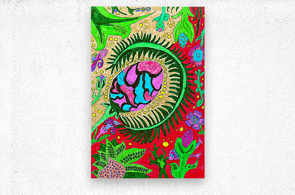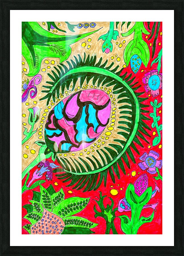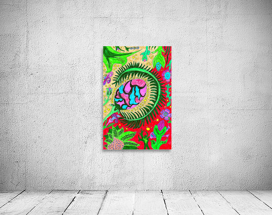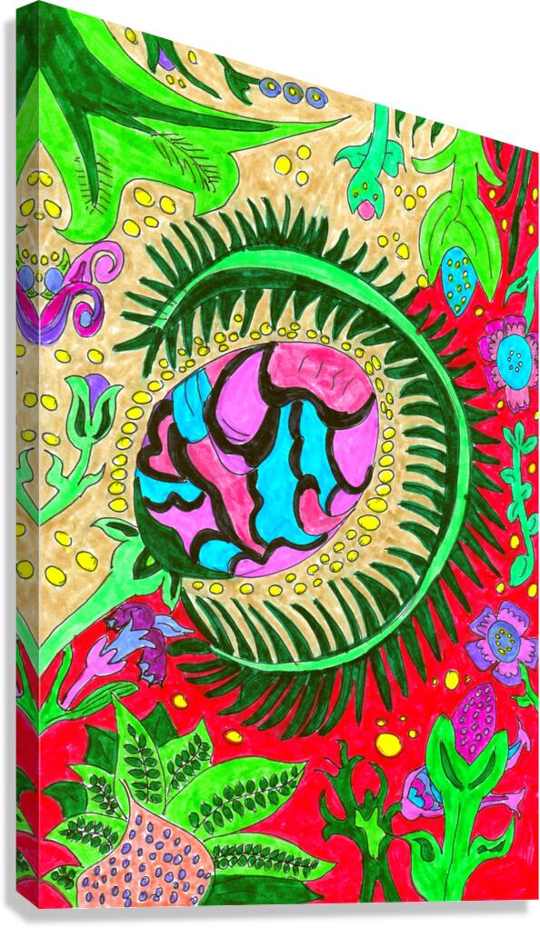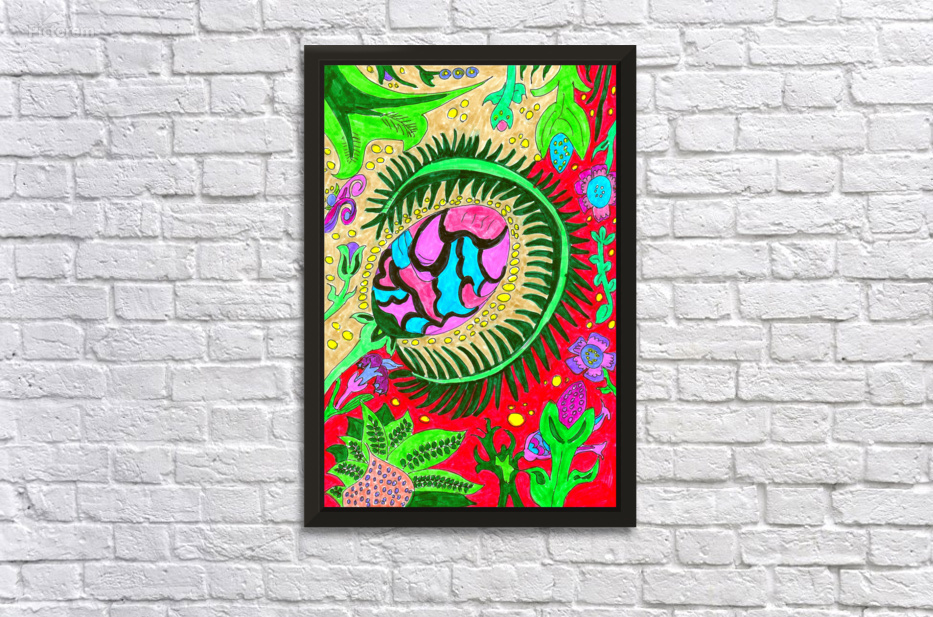 A hand drawn design created from imagination using coloured ink pens and paper. Presenting a vibrant and colorful drawing which features an abstract design with a central eye-like plant shape surrounded by various plant and organic motifs. The background is filled with a variety of shapes and forms resembling flowers, leaves, and fantastical elements, all rendered in bold, contrasting colors.