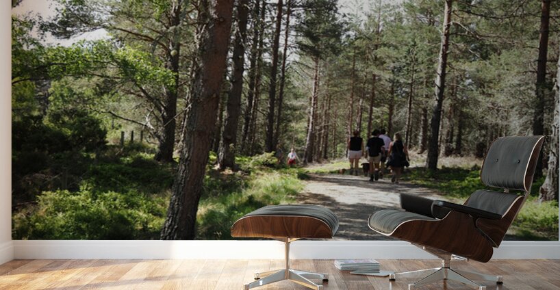 I took this photo during a lovely spring nature walk through the Scottish Highlands. Features a group of people walking along a sunlit forest path surrounded by tall Pine trees and lush greenery. The scene captures the serene atmosphere of a leisurely hike through nature.