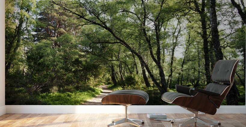 I took this photo during a lovely spring nature walk through the Scottish Highlands. Features a narrow dirt path winding through a lush Birch forest, surrounded by vibrant green foliage and tall trees. Sunlight filters through the leaves, creating patches of light and shadow on the ground.