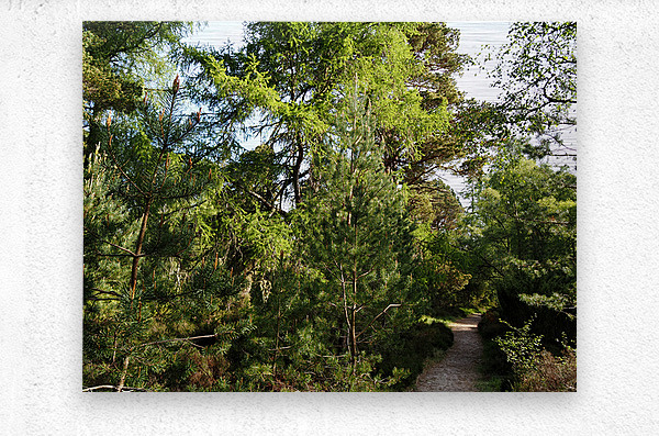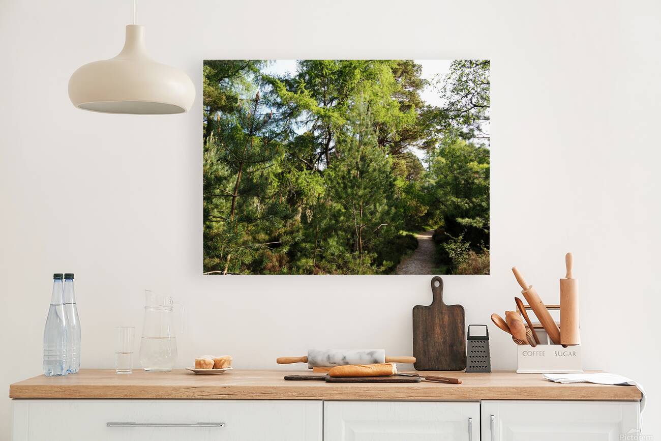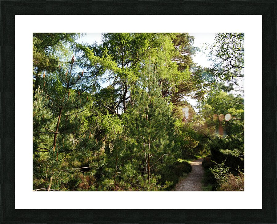 I took this photo during a lovely spring nature walk through the Scottish Highlands. Features sunlight filtering through a dense forest, highlighting the lush greenery and various shades of green on the trees. A narrow dirt path winds through the foliage, inviting exploration and a quiet walk in nature.