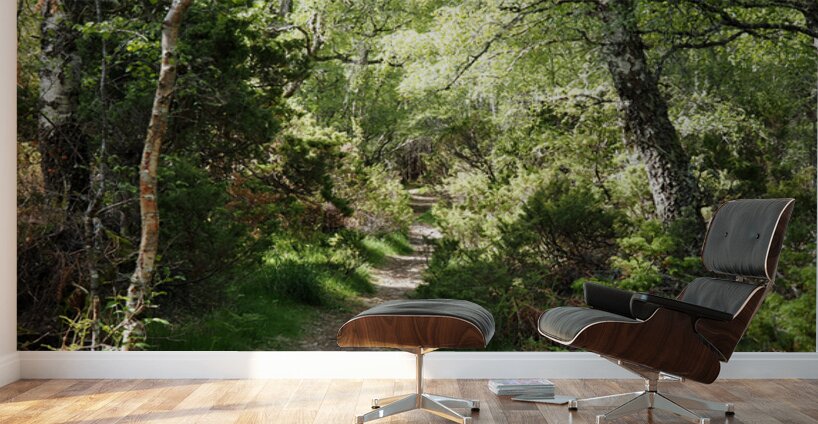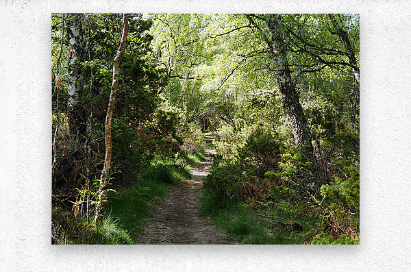 I took this photo during a lovely spring nature walk through the Scottish Highlands. Features a narrow, winding path meandering through a lush, green forest bathed in dappled sunlight. The dense foliage of birch and other trees creates a serene canopy overhead.