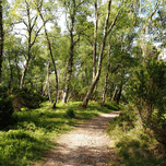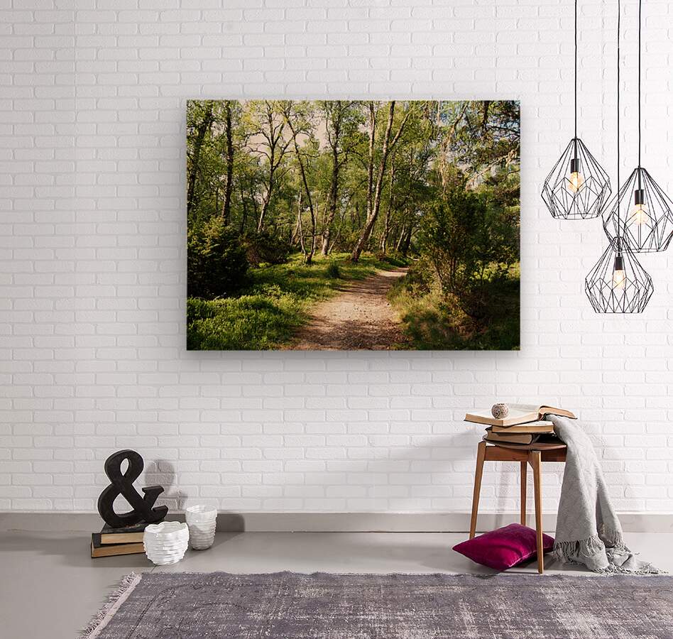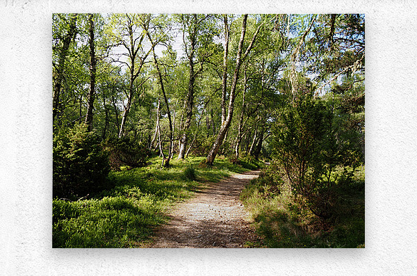 I took this photo during a lovely spring walk in the Scottish Highlands. Features a winding dirt path meandering through a lush, green forest, surrounded by tall, slender trees and dense foliage. Sunlight filters through the leaves, creating dappled patterns on the ground.