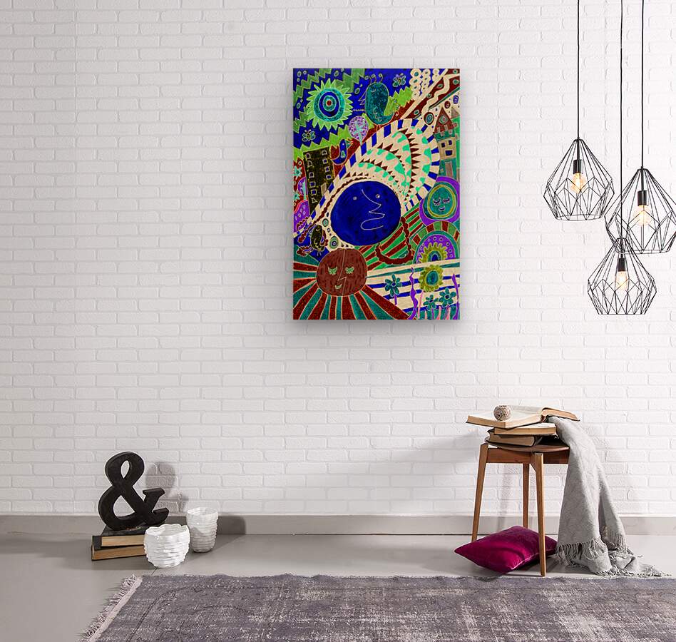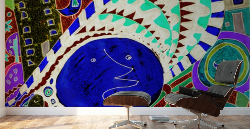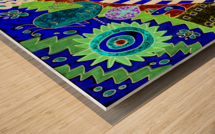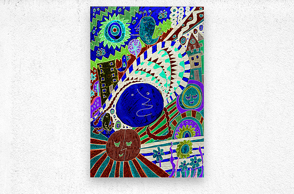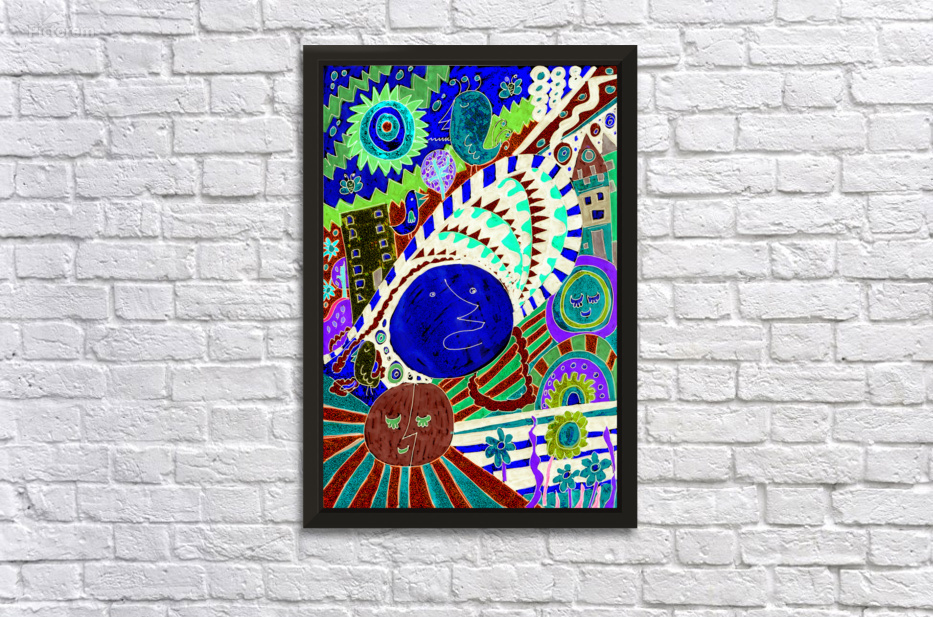 Originally a hand drawn design created from imagination using coloured ink pens and paper. Laterally digitally manipulated into vibrant colors and whimsical shapes which dominate the composition, creating a sense of playfulness and fantasy. Various abstract and stylized elements, which could be interpreted as plants, eyes, and other organic forms, are interwoven throughout the space.