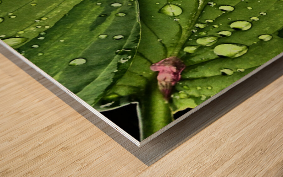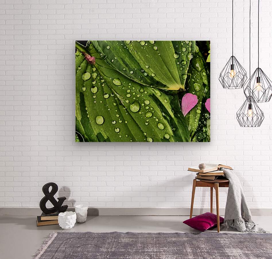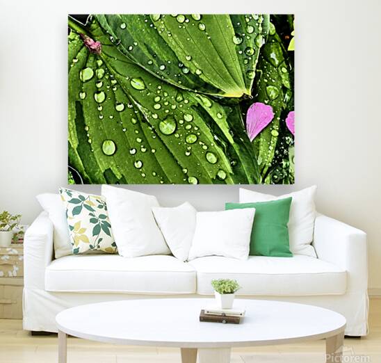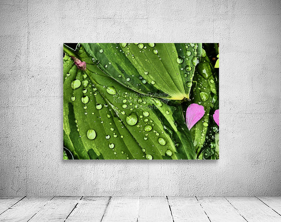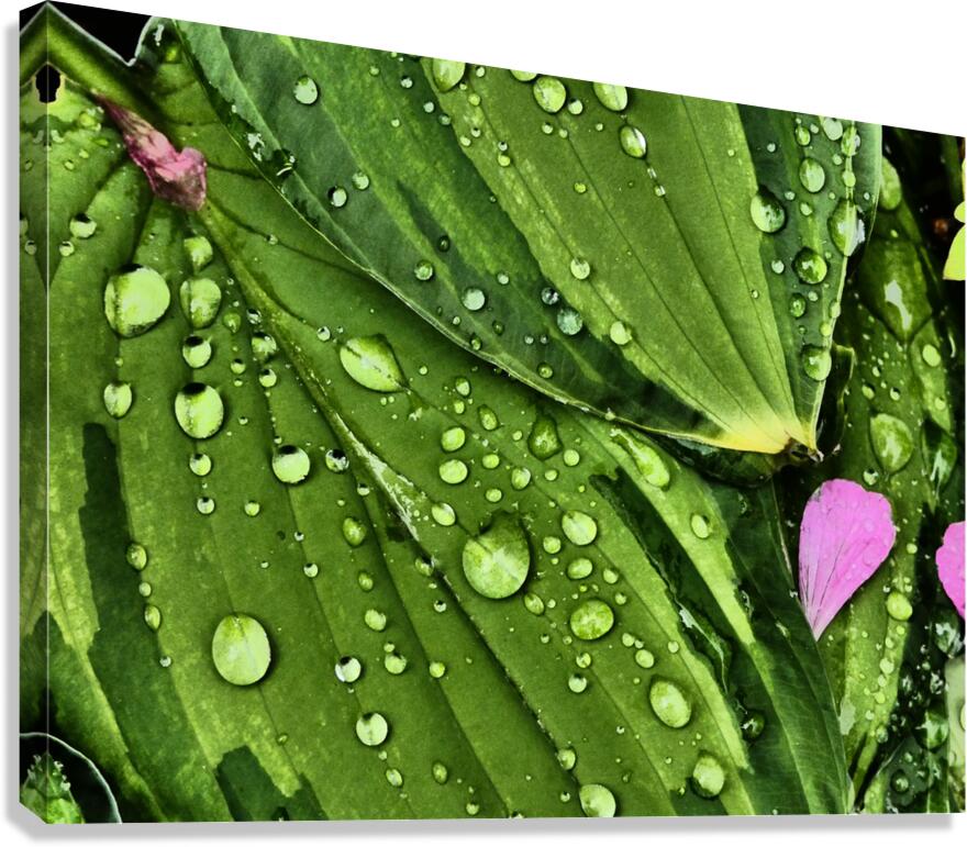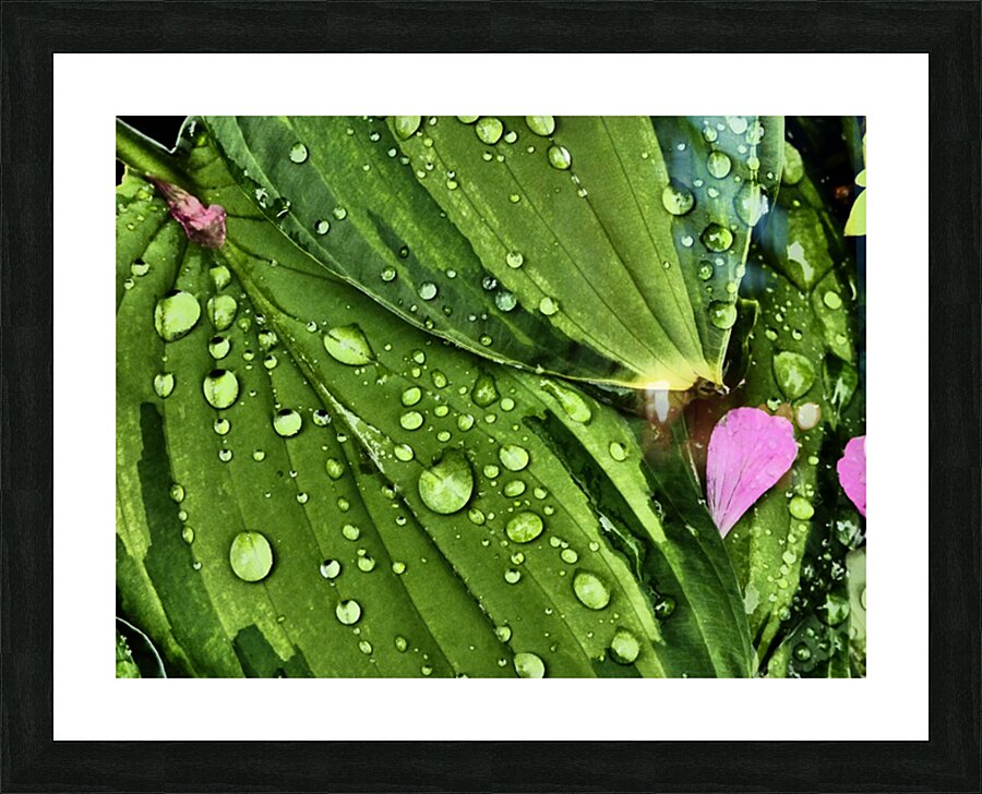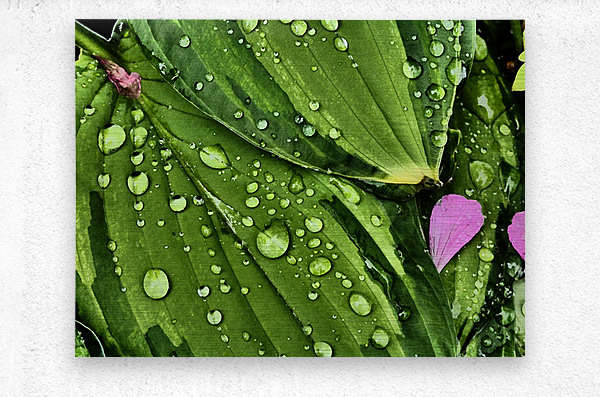 I took this photo during a lovely summer day using the Intelligent Art photographic filter. Features water droplets rest on vibrant green Hosta leaves, creating a fresh and lively appearance. A few pink Geranium petals are scattered among the leaves, adding a touch of contrasting color.