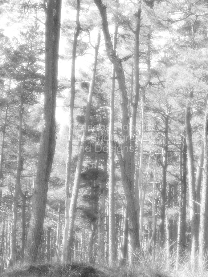 I took this photo during a lovely summer nature walk through the Scottish Highlands. Features tall, slender Pine trees stretching upwards, creating a serene and ethereal forest scene. The sunlight filters through the branches, casting a soft glow over the woodland area.