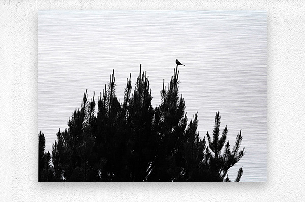 I took this photo during a lovely spring nature walk through the Scottish Highlands, using a monochrome photographic filter which gives a grainy effect when image enlarged. Features a silhouette against a bright sky, with a lone bird perched atop the highest branch of a pine tree. The stark contrast emphasizes the intricate shape of the branches and the bird's delicate form.