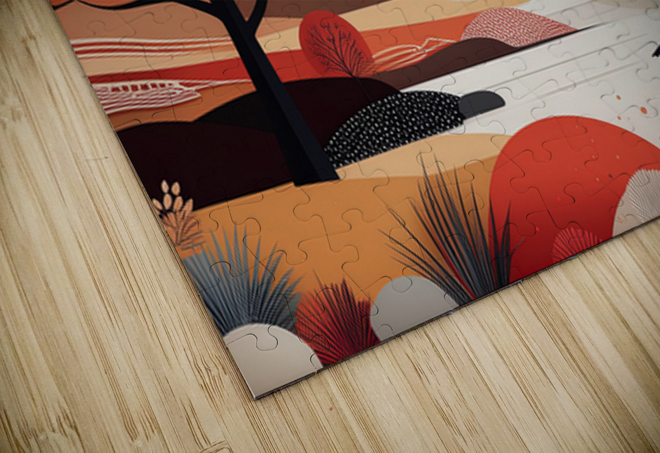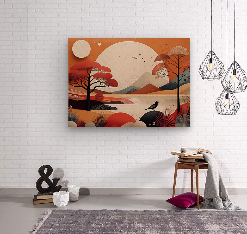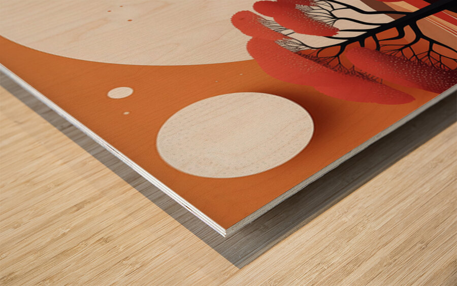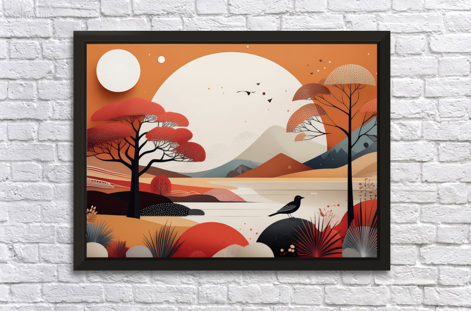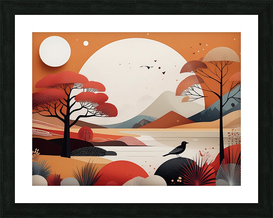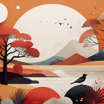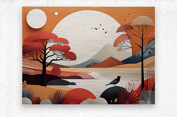 Immerse yourself in the tranquility of this stylized landscape where Japanese influence melds with an autumnal palette. Organic shapes and warm tones evoke a profound serenity ideal for creating a welcoming ambiance. This illustration reminiscent of mixed media techniques captures a moment of abstract natural beauty perfect for elevating any space with a touch of artistic elegance and contemplative calm. --> AI-assisted digital art.