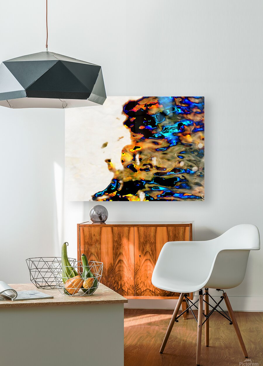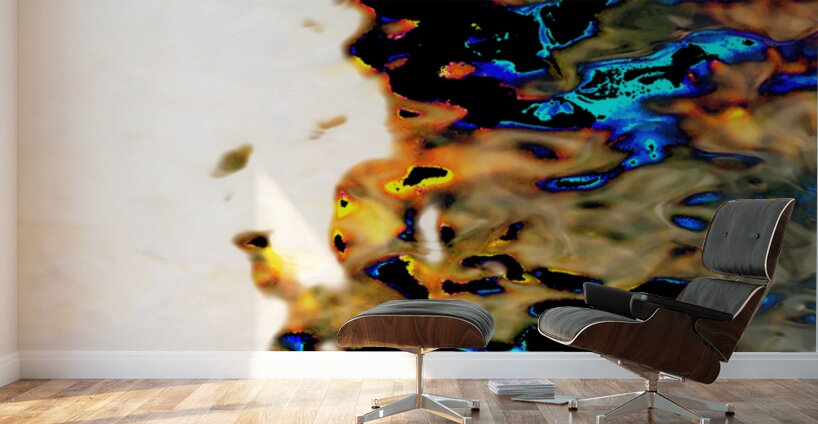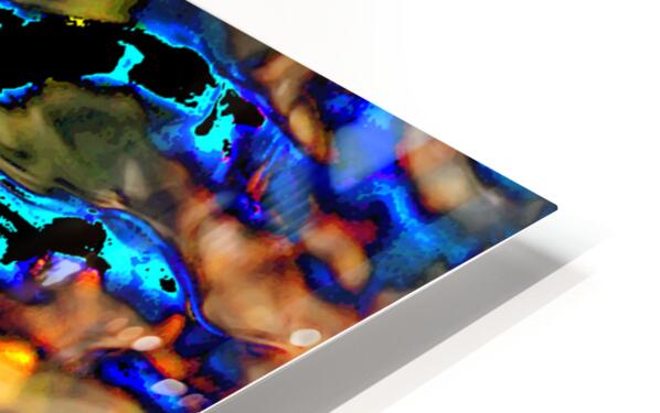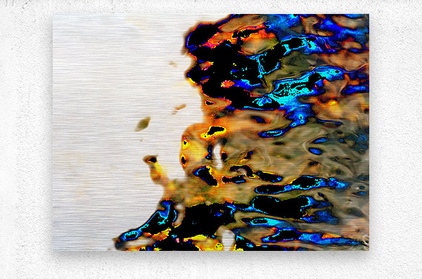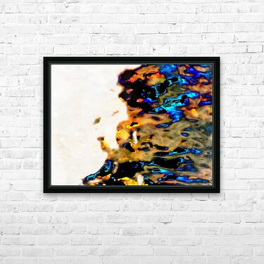 I took this photo of river water reflections during a lovely spring nature walk through the Scottish Highlands. Laterally I couldn't resist experimenting with the colours and digitally manipulated these to create this stunning piece of contemporary abstract art. Features vibrant colors blending into an abstract pattern with a mix of blues, oranges, and blacks forming a fluid, dynamic effect. The composition resembles mineral formations or perhaps a topographical map.