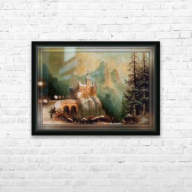 Winter Landscape With Castle In The Mountains (Winterlandschaft mit Schlossanlage im Gebirge) c~ by German-Russian Painter Albert Bredow (1828 - 1899), who was also a lithographer and stage designer; specializing in landscape paintings. The painting depicts a winter landscape with a curved road leading to a castle on a hilltop, set against a beautiful mountain range backdrop with a lush green forest covered in winter clouds. This is a retouched digital art old masters reproduction of a public domain image.