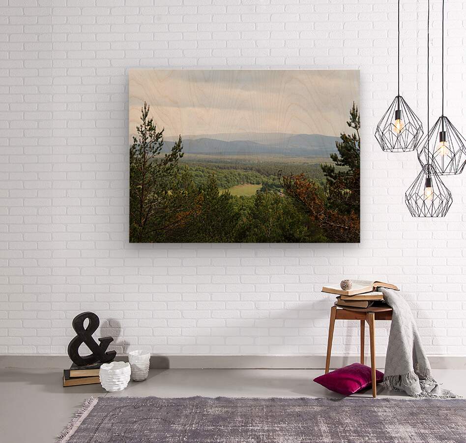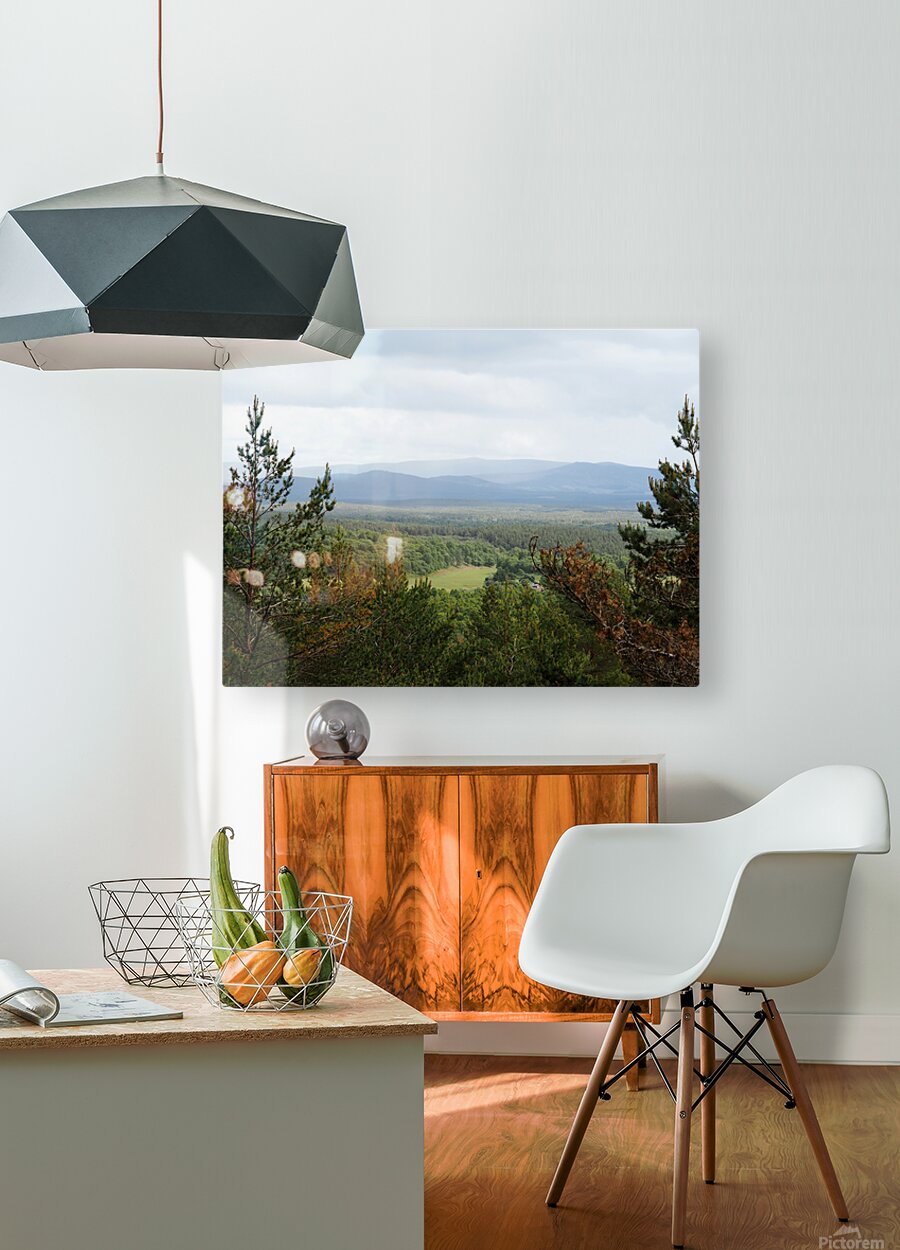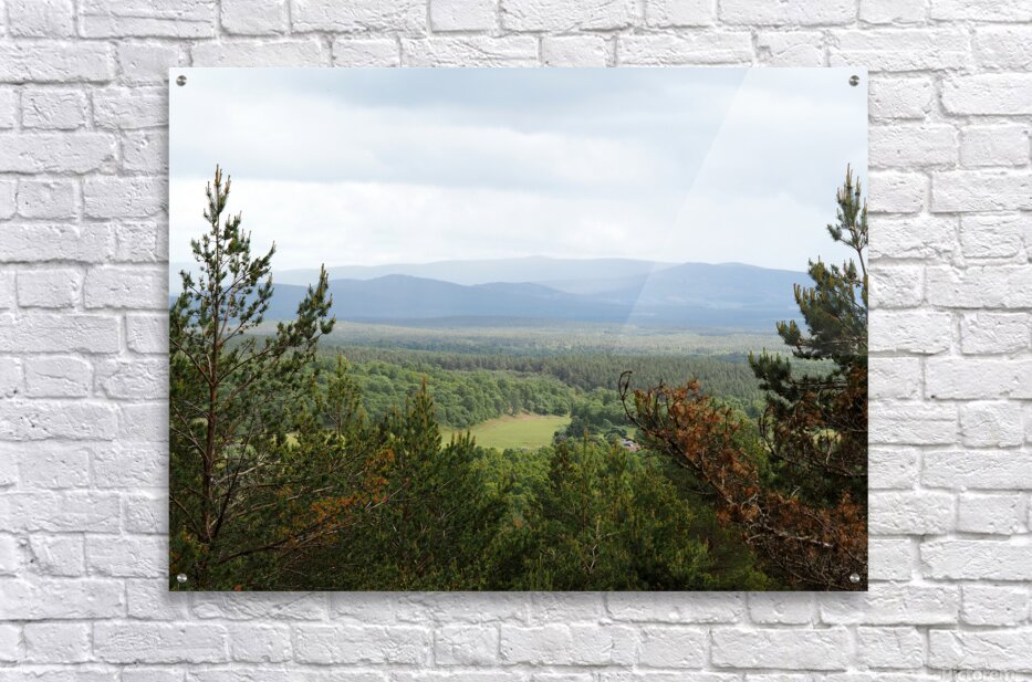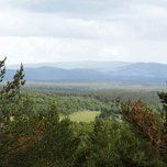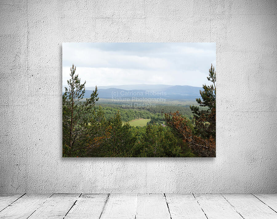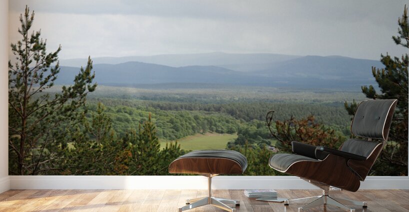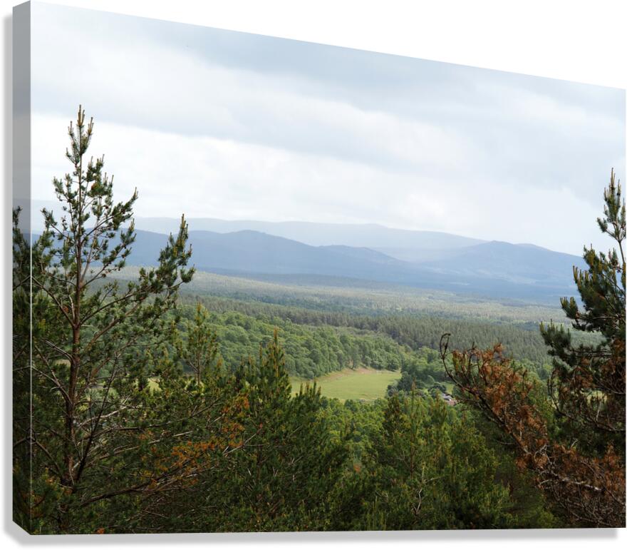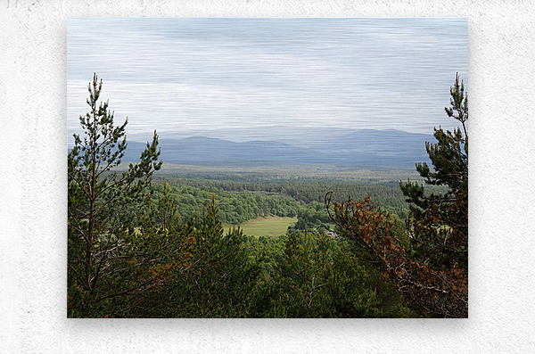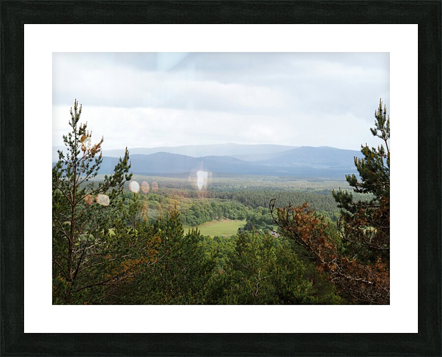 I took this photo during a lovely spring nature walk through the Scottish Highlands. Features a lush, green forest stretching across rolling hills under a cloudy sky, with distant mountains visible on the horizon. Pine trees frame the foreground, adding depth to the expansive landscape view.