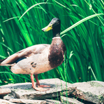 A mallard takes a curious look in our direction. Posing on the stones that line a small pond, the bird stands out brilliantly against the backdrop of ...[+]