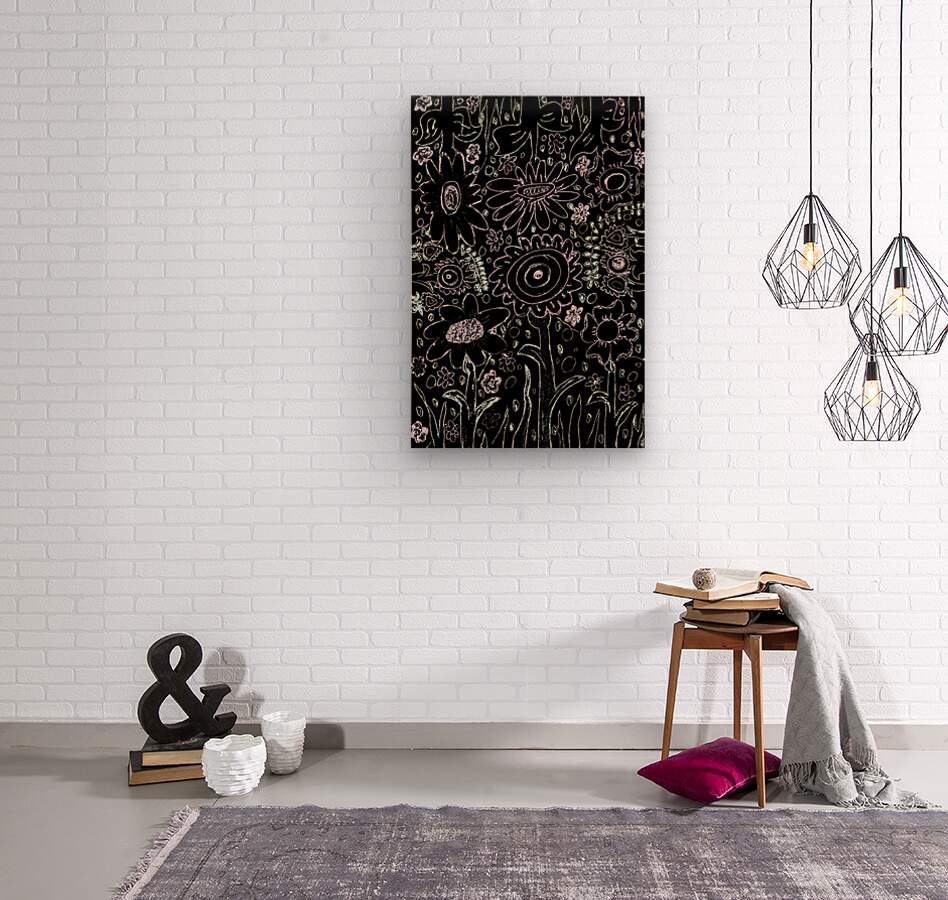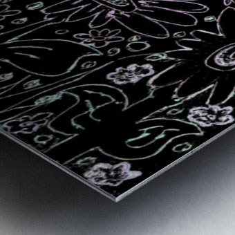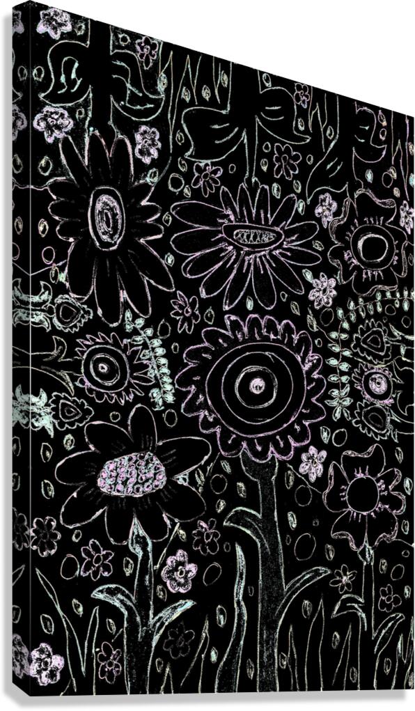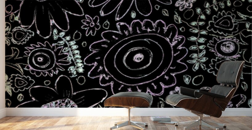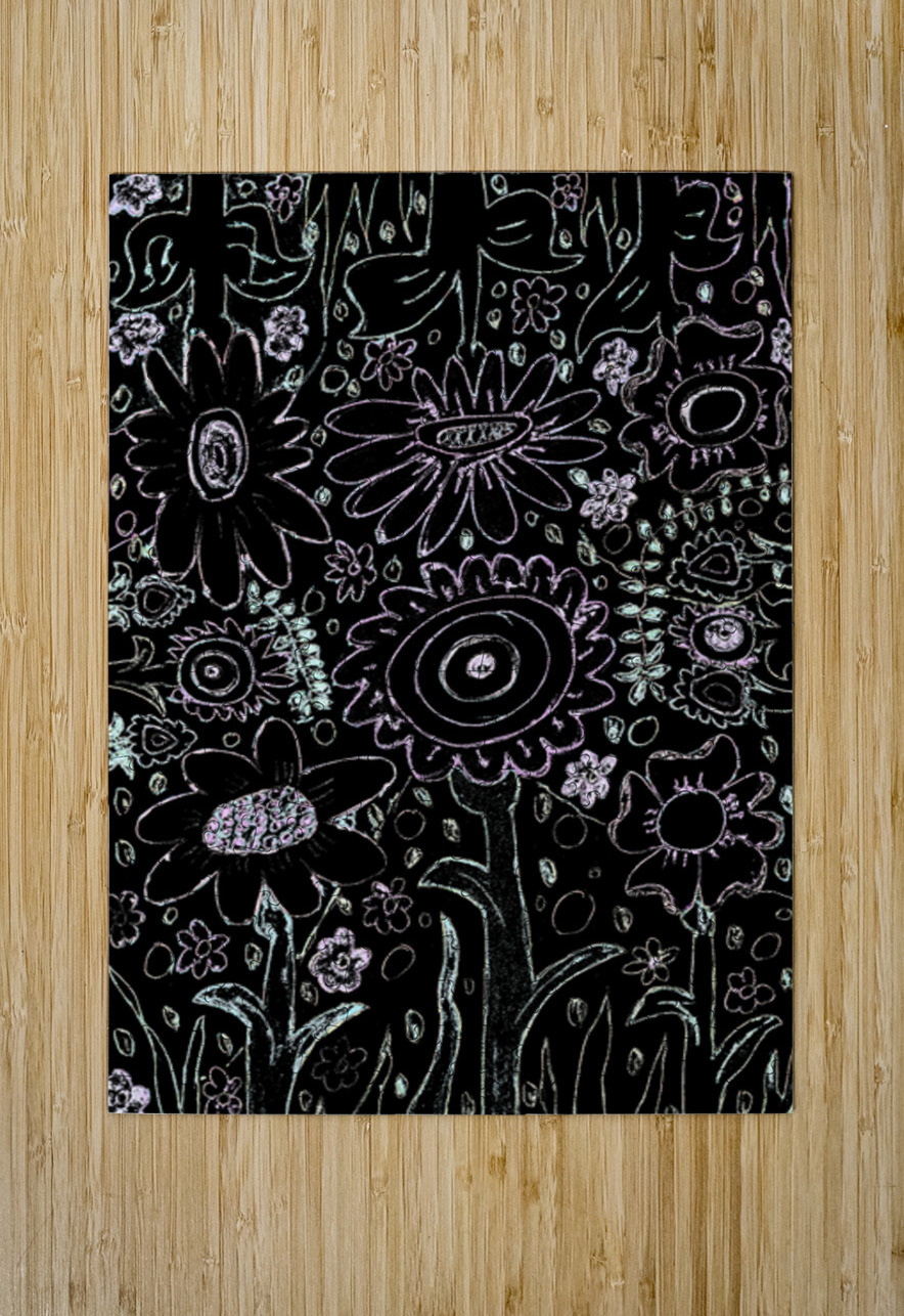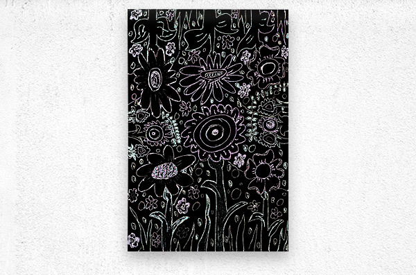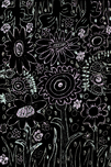Originally a hand drawn design created using coloured ink pens and paper. Features a vibrant, abstract floral patterns on various flowers with swirling designs and visible stems set against a dark background. The lively arrangement of the blooms creates a whimsical and enchanting garden scene.