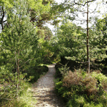 I took this photo during a lovely spring nature walk through the Scottish Highlands. Features a narrow dirt path winding through a lush, green forest, surrounded by a variety of trees and dense undergrowth. Sunlight filters through the canopy, casting dappled shadows on the ground.
