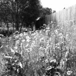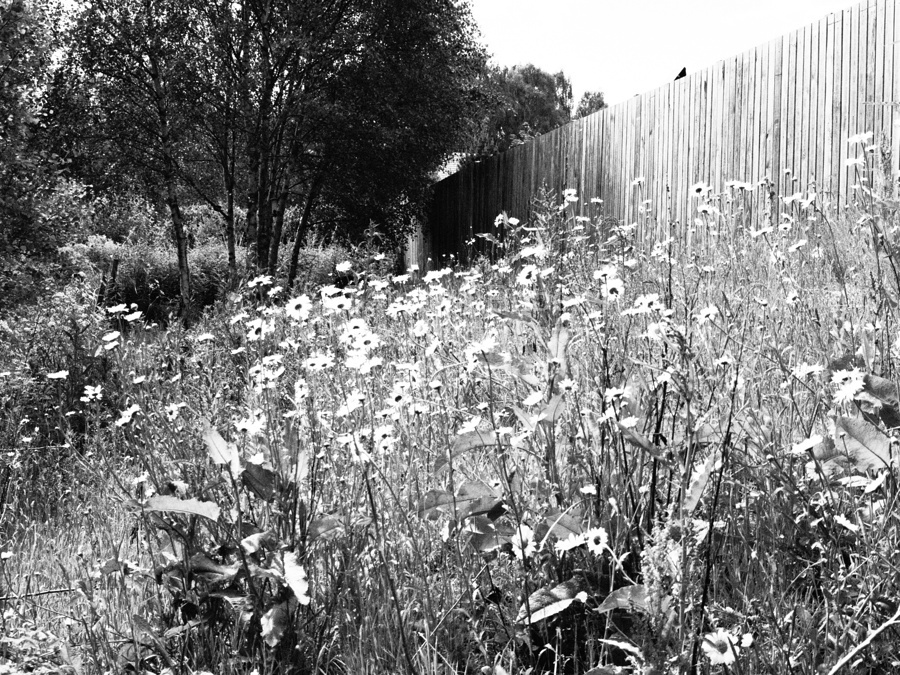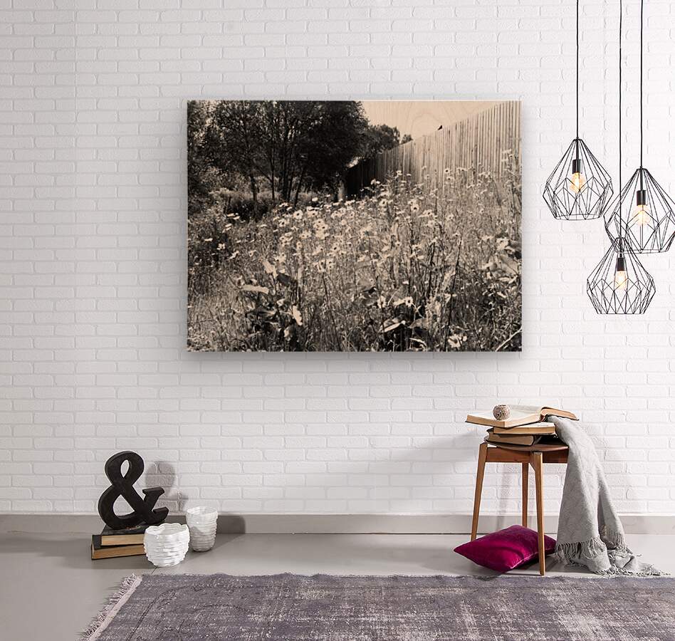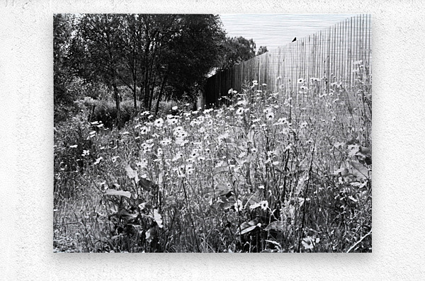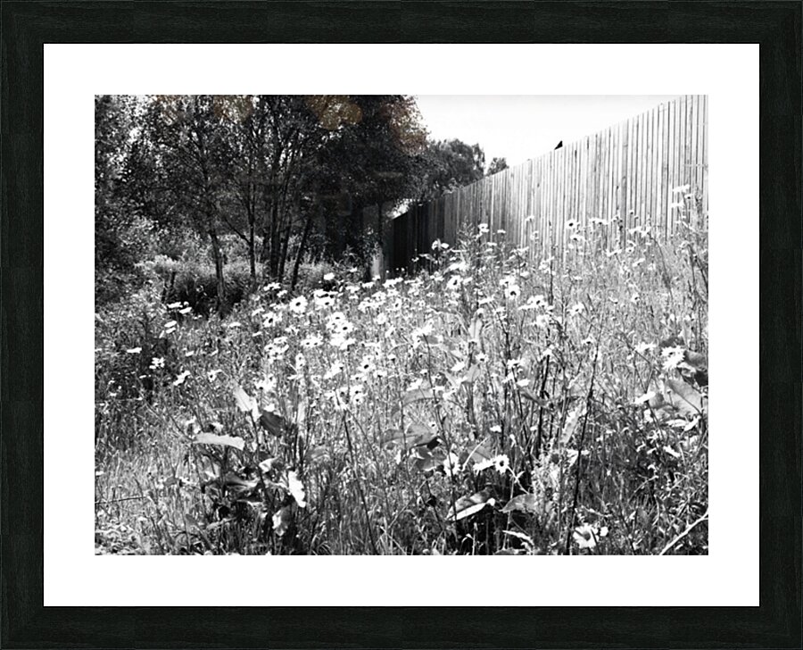 I took this photo during a lovely spring nature walk through the Scottish Highlands. Features a field of wildflowers flourishing under the sunlight, extending alongside a tall wooden fence. In the background, trees add depth to the tranquil landscape.