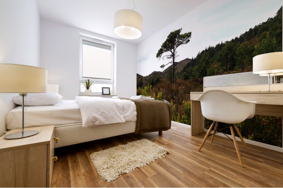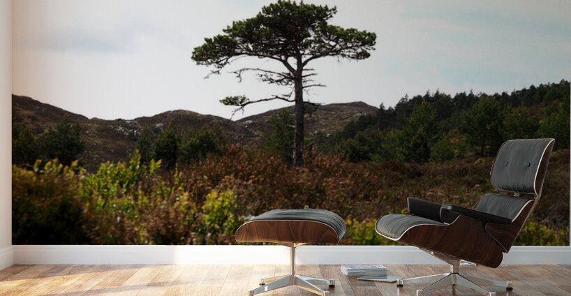 I took this photo during a lovely spring nature walk through the Scottish Highlands. Features a lone Pine tree standing prominently against a backdrop of rolling hills and dense greenery. The landscape depicts a serene, natural scene with muted earthy tones under a soft sky.