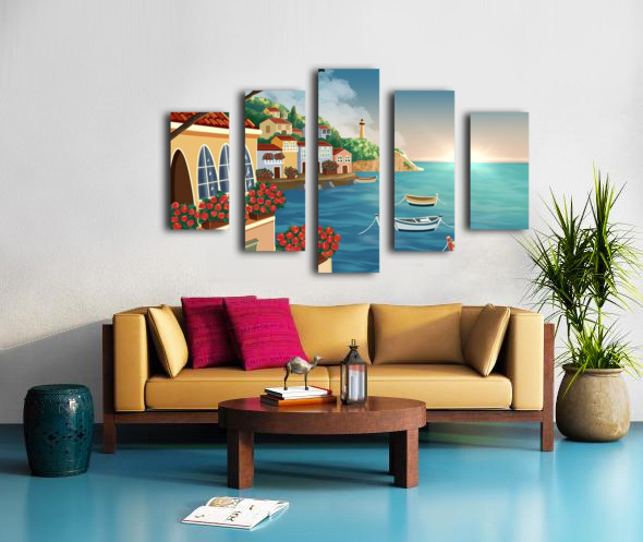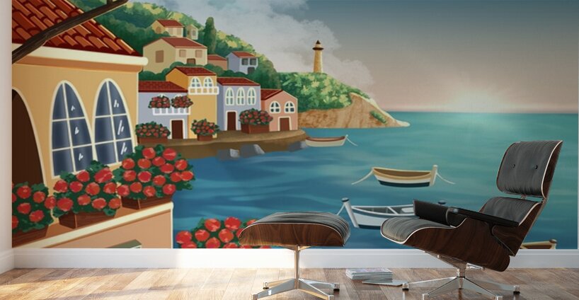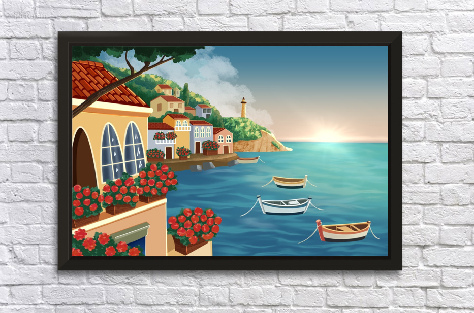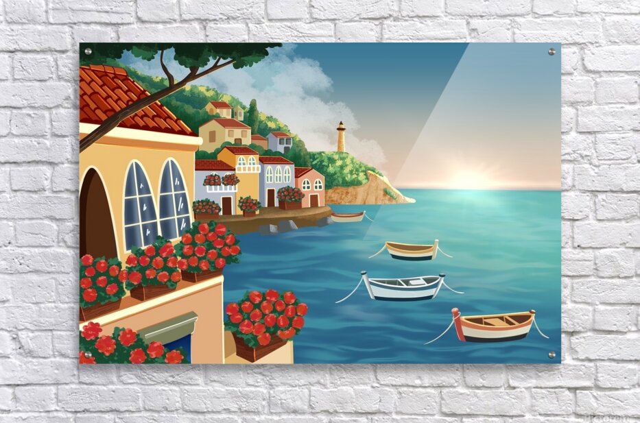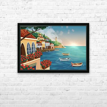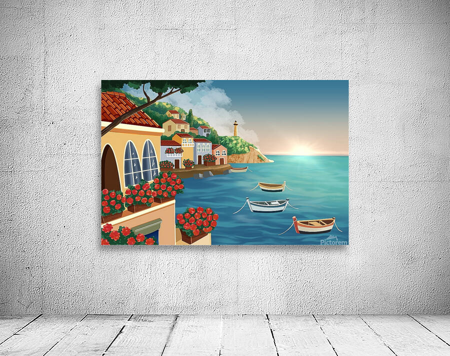 Immerse yourself in the tranquil beauty of a coastal village captured at sunset. This vibrant illustration features charming houses adorned with blooming flower pots, nestled along a shimmering blue sea. Gentle waves lap against colorful boats, while a lighthouse stands proudly on the distant shore, creating a picturesque scene that evokes feelings of peace and nostalgia. Perfect for adding a touch of coastal charm to your home or office decor.