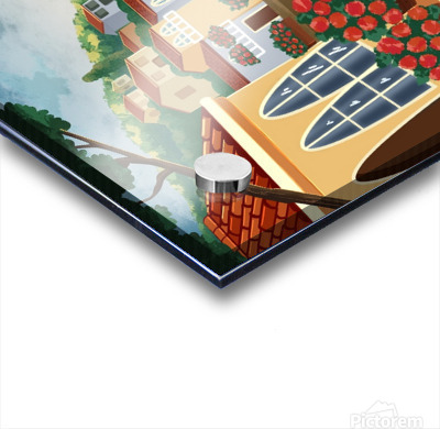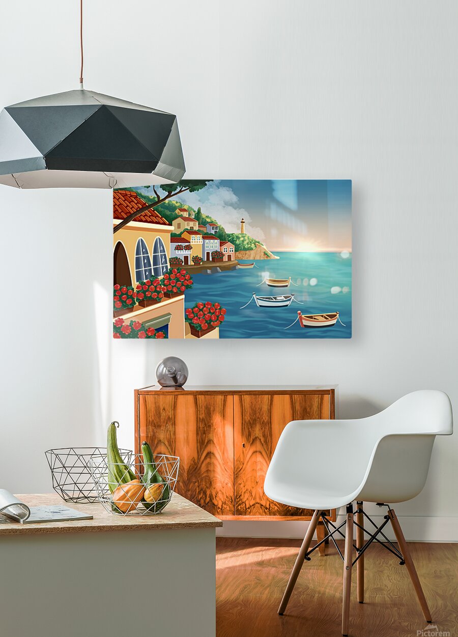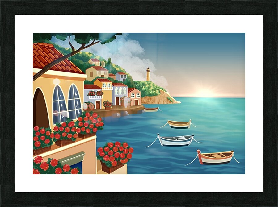 Get this artwork "Serene Coastal Village at Sunset" in a framed print.