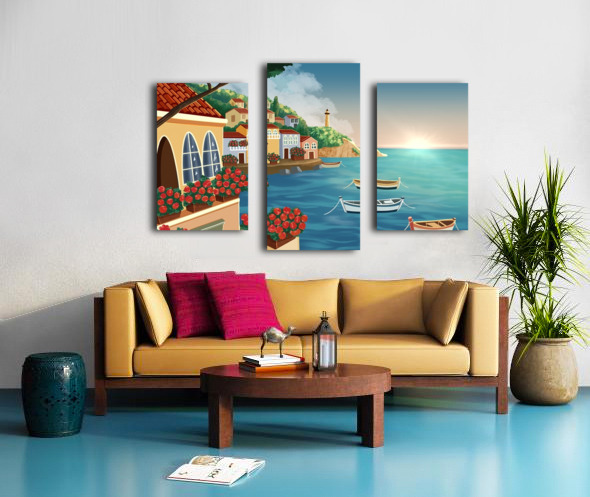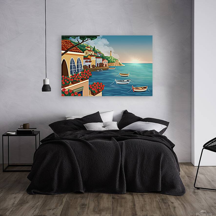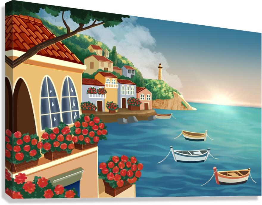 SERENE COASTAL VILLAGE AT SUNSET SARAH ILLUSTRATOR  Canvas Print