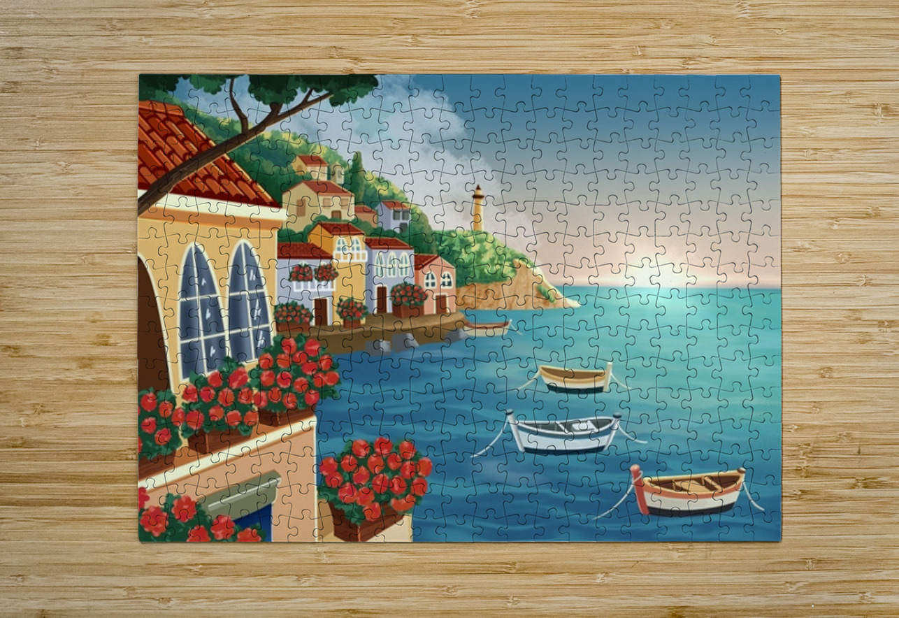 Serene Coastal Village at Sunset sarah illustrator Puzzle printing