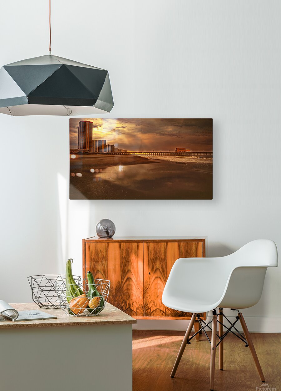 The magnificent long wooden fishing pier, Apache Pier in Myrtle Beach offered me up soft golden, amber sunrise sunbeams and romantic skies this morning. The Atlantic Ocean beach standing pools reflecting the impending picture perfect storm clouds overhead. The pier's vibrant colors, salty breeze, and breathtaking horizon landscape presented a magical atmosphere.