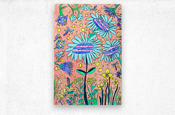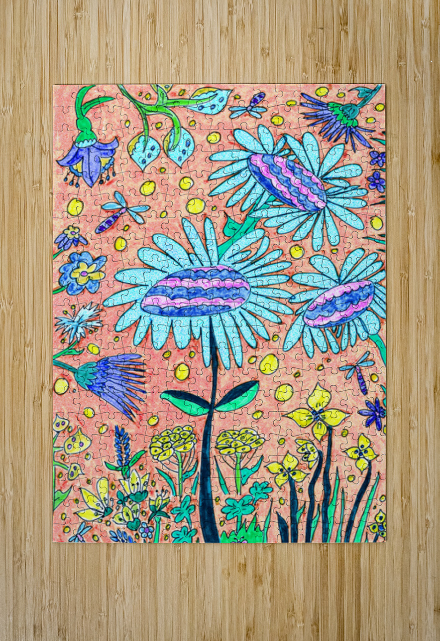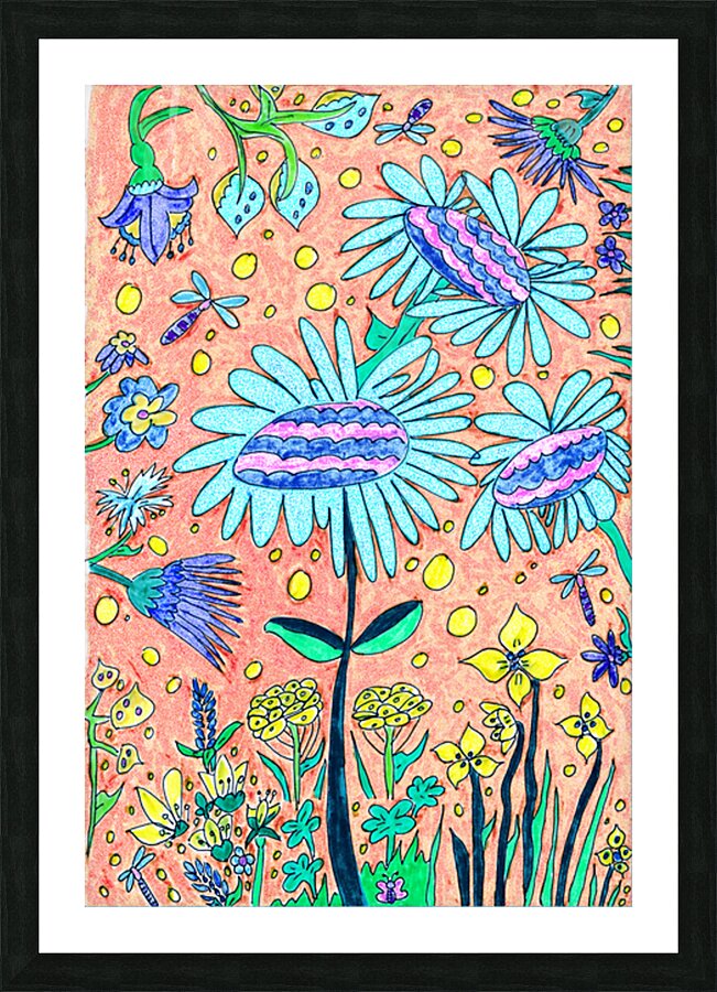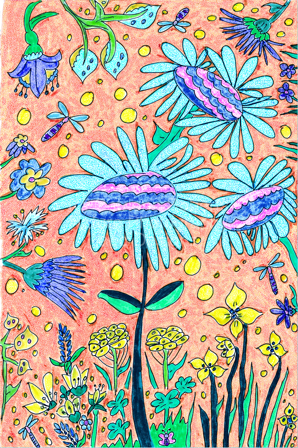 Originally a hand drawn nature inspired design created using ink pens and paper. Laterally digitally manipulated into a variety of stylized flowers and plants which are colorfully depicted with a dominant presence of blue daisy-like flowers featured in the center. Dragonflies and smaller flowers are scattered throughout the composition, adding whimsy and a sense of lively interaction within the natural elements.
