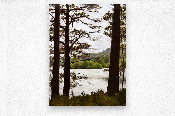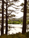 I took this photo during a lovely summer nature walk through the Scottish Highlands. Features tall Pine trees standing silhouetted against a serene loch, with lush green foliage in the background. The scene is peaceful, showcasing the beauty of a natural landscape with a tranquil body of water.