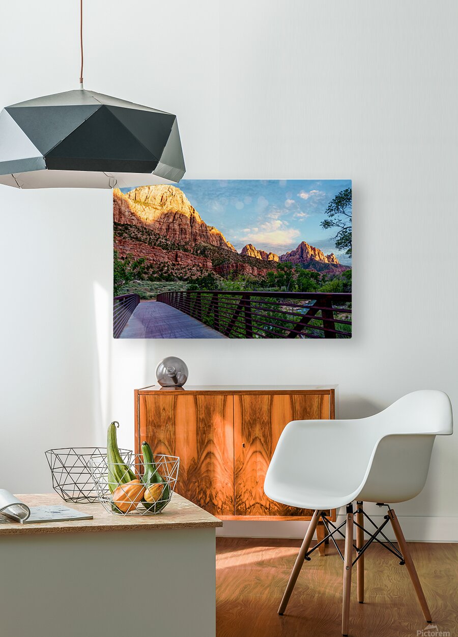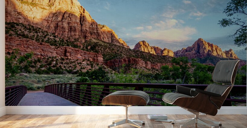 A beautiful sunset from one of the walkway bridges that crosses over the Virgin River with The Watchman rock mountain formations in the background. Located in Zion National Park, this area is popular for it's sunsets as you can see why. The golden sunlight makes the top part of the rock glow as part of the formations and trees fall into the shadows. The cool waters of the river flow through this breathtaking landscape. Located in Springdale, Utah, United States, Zion is the third most visited national park in America. It's beautiful red rock mountains and cliffs along with trees and green vegetation make it stunning. This photo was taken by Jennifer White with Timeless Moments Photography. All images are copyrighted © Timeless Moments Photography/Jennifer White. All rights reserved. Please note the watermark does not print on ordered products.