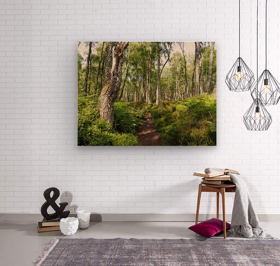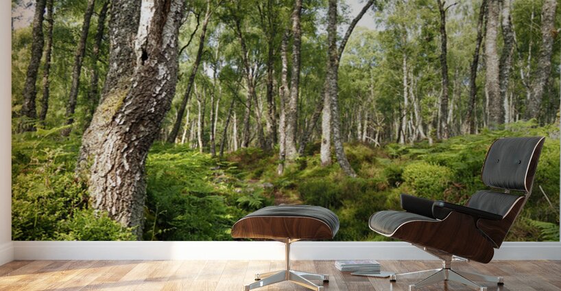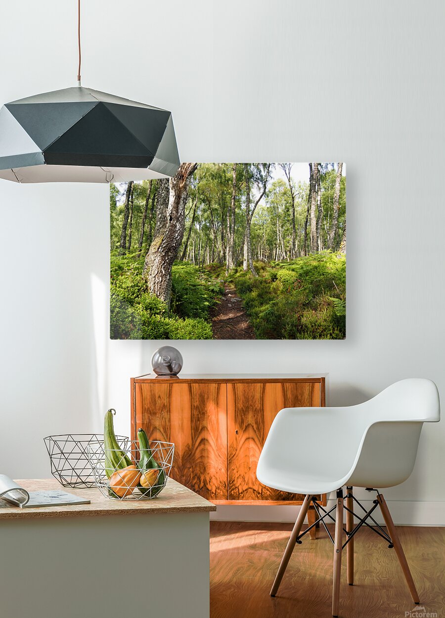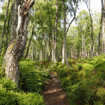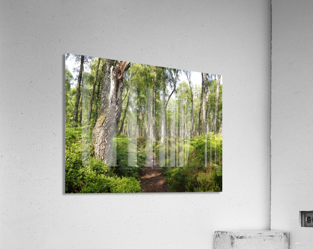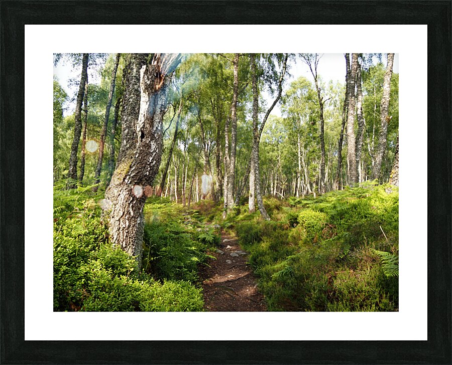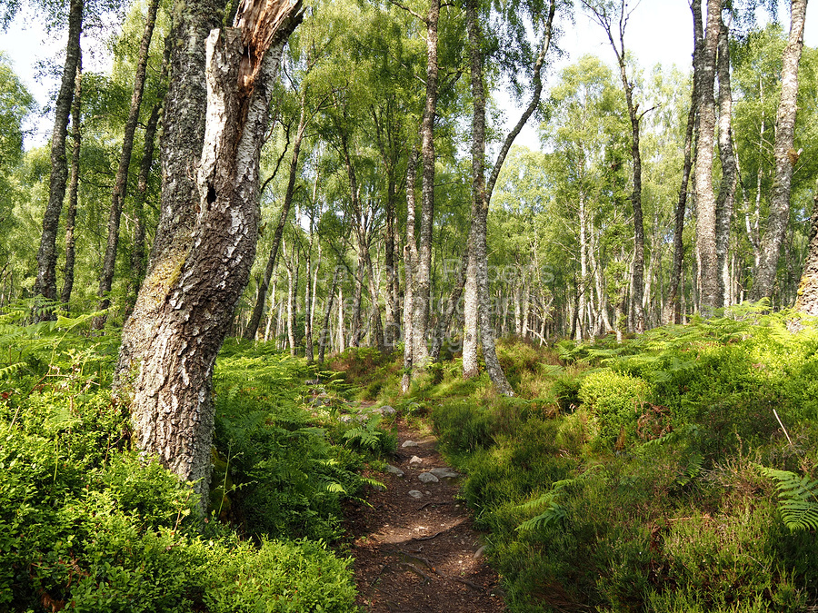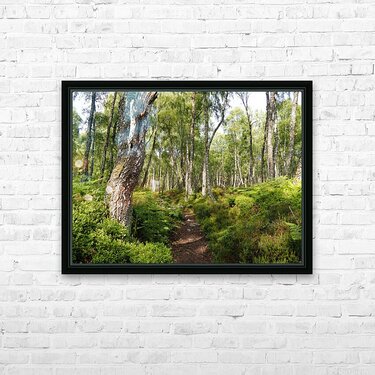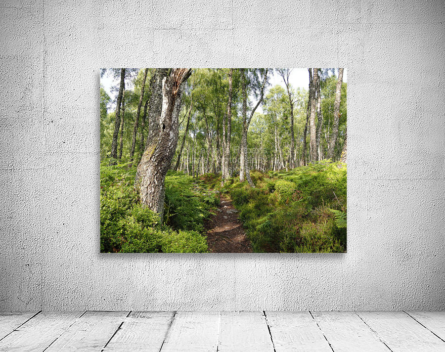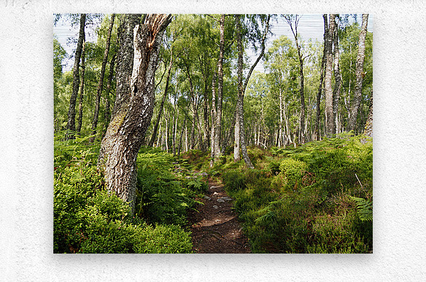 I took this photo during a lovely spring nature walk through the Scottish Highlands. Features tall Birch trees stretching upwards, their trunks surrounded by lush green ferns and undergrowth. A narrow dirt path winds through the forest, inviting exploration.