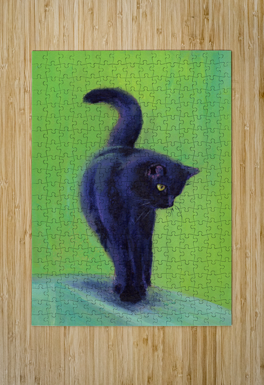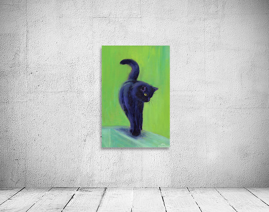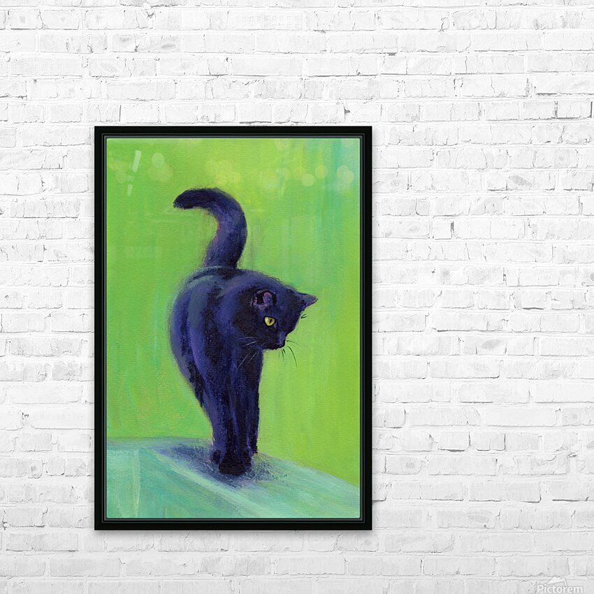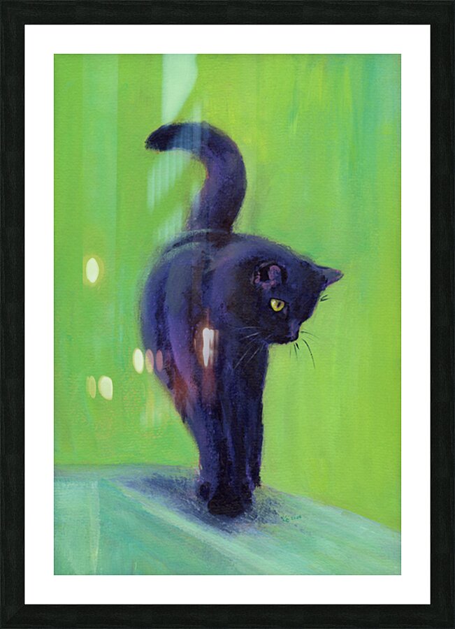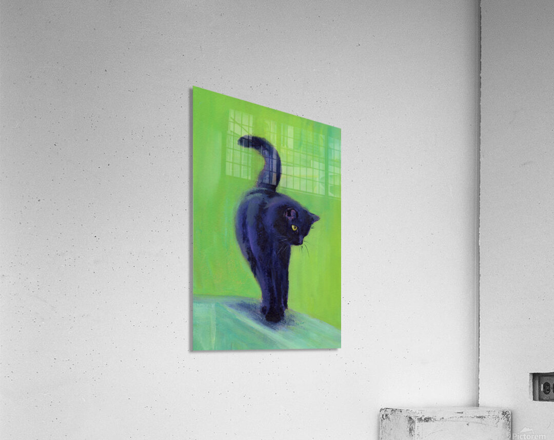 On the catwalk is a hand-painted acrylic painting in portrait format by artist Karen Kaspar. A black cat balances on the thin bar of a wooden fence. T...[+]