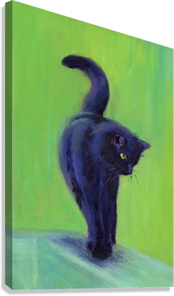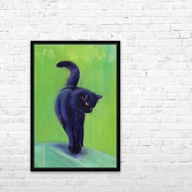 On the catwalk is a hand-painted acrylic painting in portrait format by artist Karen Kaspar. A black cat balances on the thin bar of a wooden fence. The elegant pose with its paws placed in front of each other and its tail curved upwards gives the impression that the beautiful animal with its shiny black fur is walking on a catwalk like a model. The cat's yellow-green eyes are directed attentively to the left, conveying a sense of curiosity or concentration. The background is abstracted in bright lime green and light green shades, suggesting a natural environment such as the foliage of bushes or trees. The picture is painted with loose and expressive brushstrokes. 594