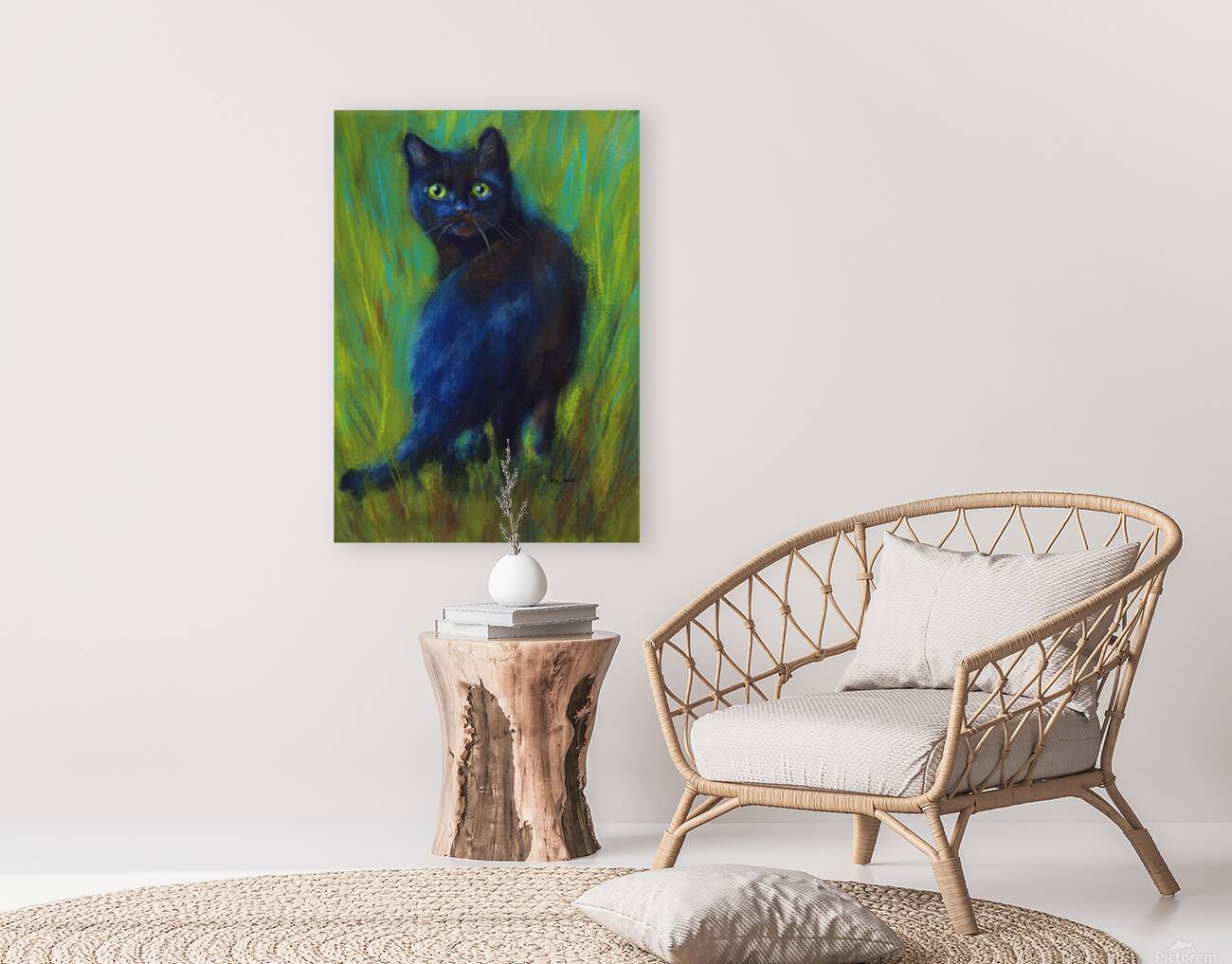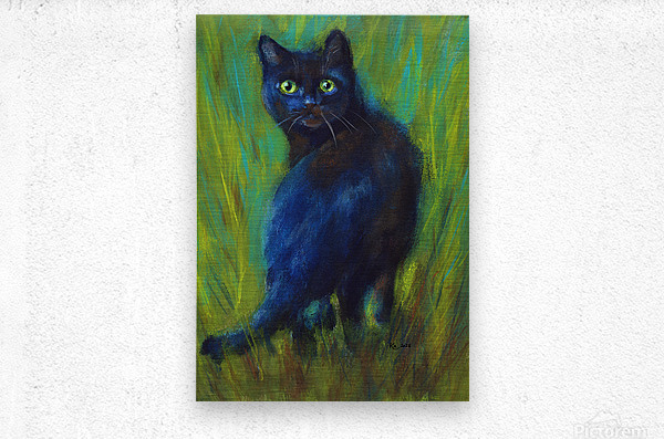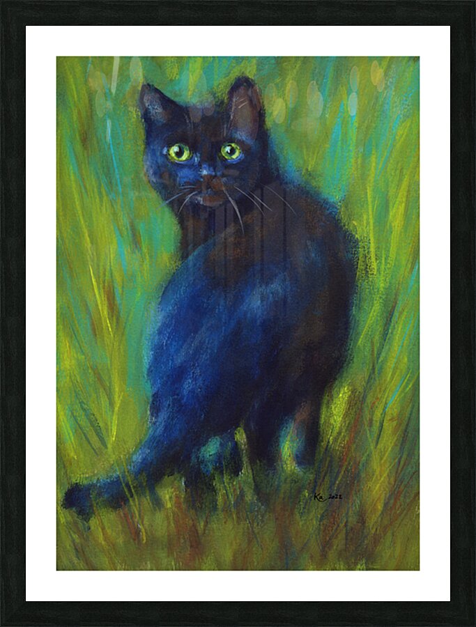 Get this artwork "Black cat in the green grass acrylic painting " in a framed print.