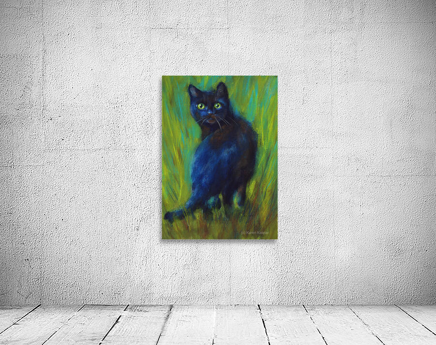 Black cat in the green grass is an acrylic painting in portrait format painted by artist Karen Kaspar. A black cat is walking in the green grass. You see her from behind. She turns her head in the direction of the viewer and looks at you with green eyes. A black cat is on the prowl in the green grass in my garden. Its our neighbours cat visiting the mice in our garden. She is looking at me with her big green eyes as if she was saying What do you want please dont disturb me!. This cat portrait is painted with acrylic paint in bold expessionistic brushstrokes. Fine art prints and home decor from original artwork paintings and photography by artist Karen Kaspar. 228