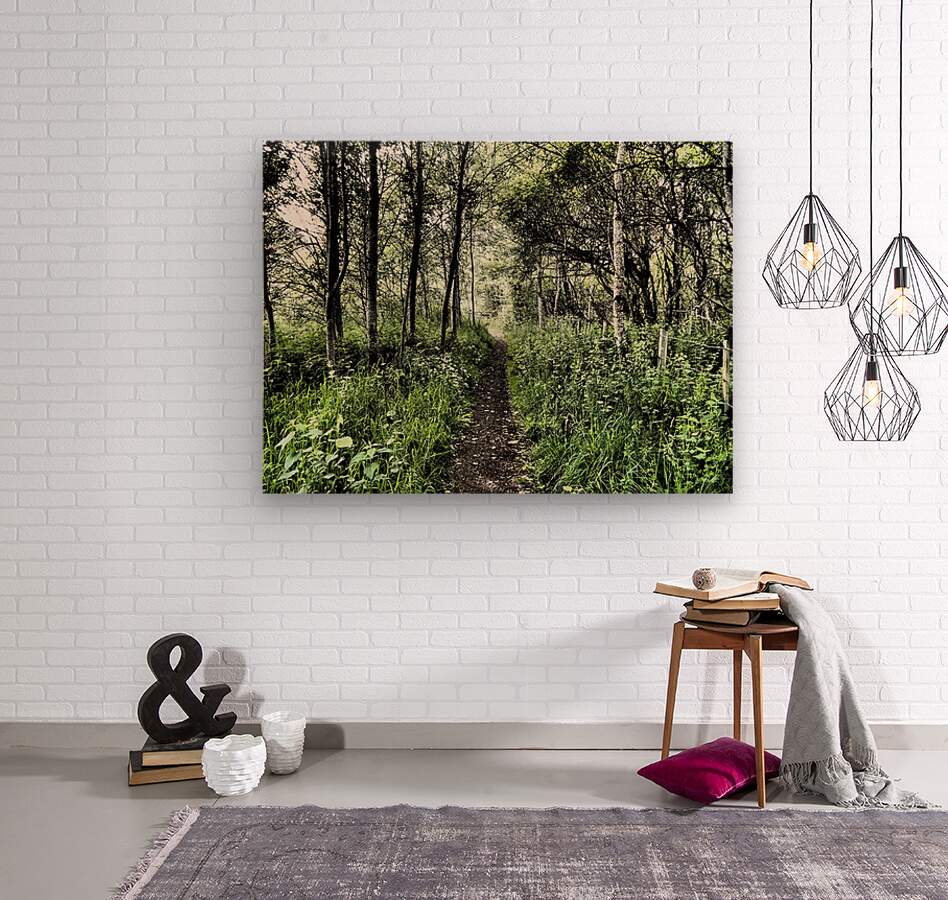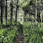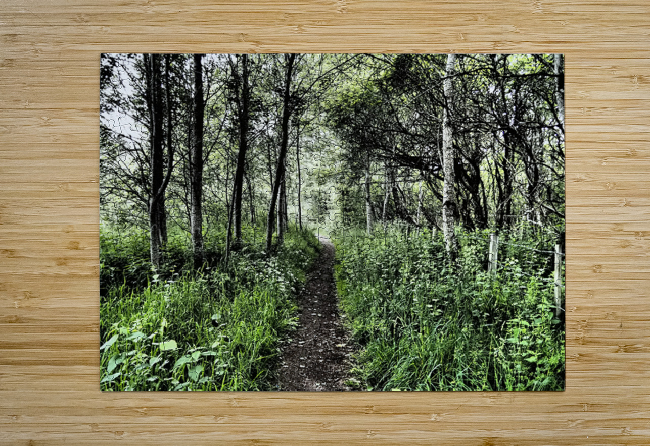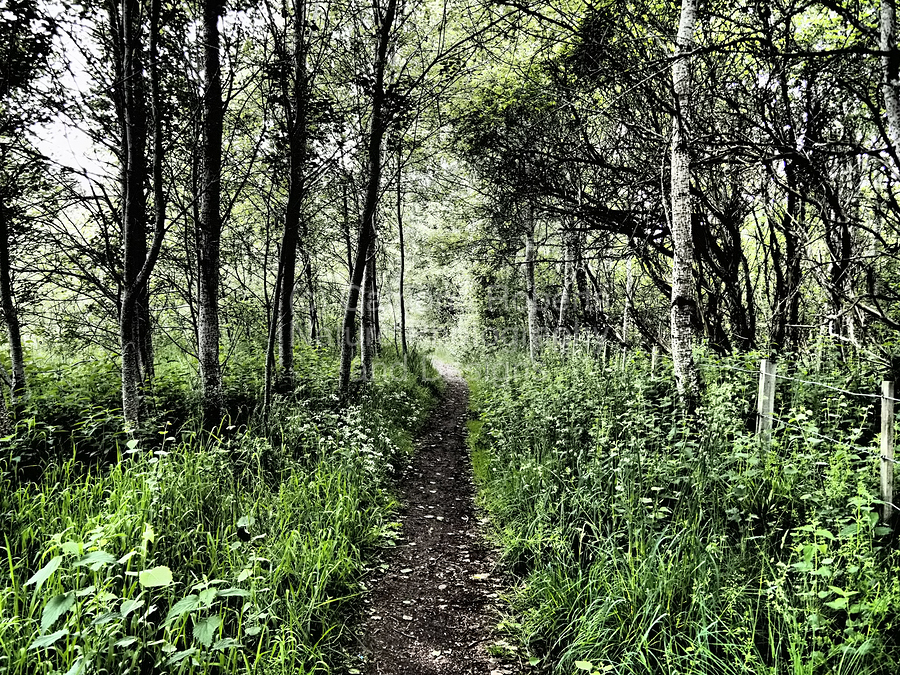 I took this photo during a lovely spring nature walk through the Scottish Highlands. Features a narrow dirt path winding through a lush, green forest surrounded by tall grasses and dense foliage. Sunlight filters through the leafy canopy above, creating a peaceful and inviting atmosphere.