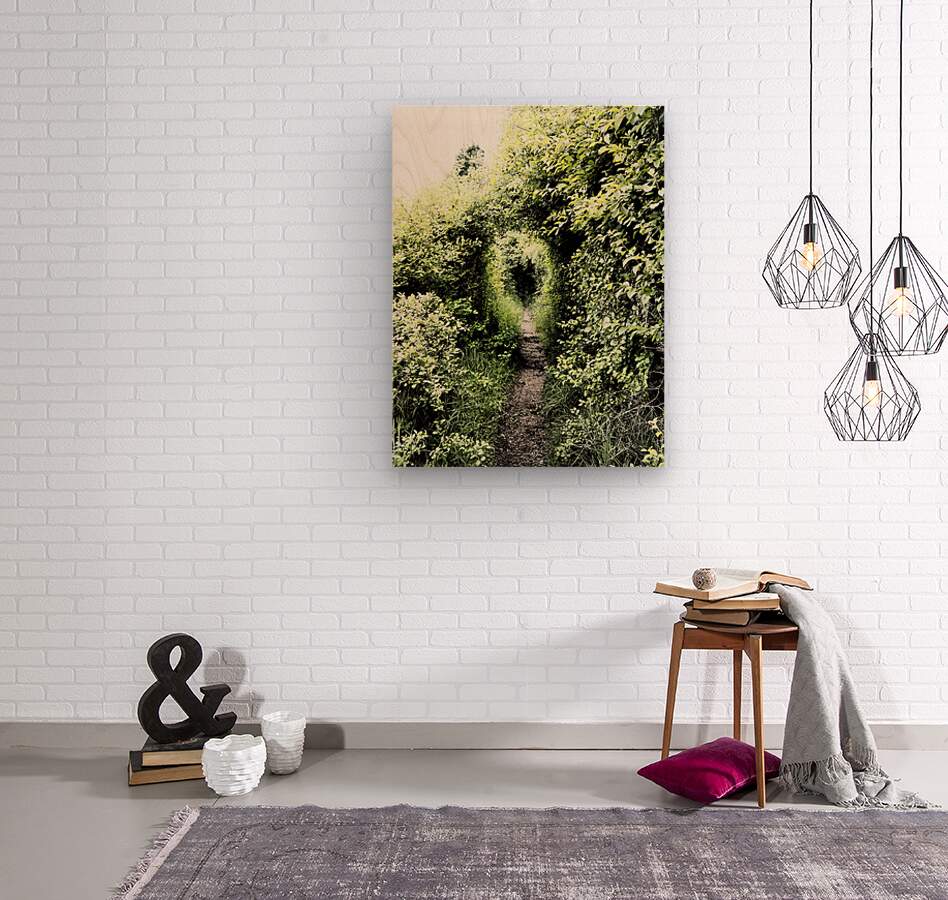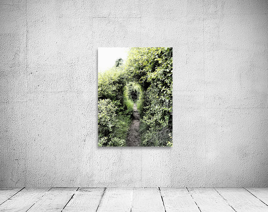 I took this photo during a lovely late spring nature walk through the Scottish Highlands. Features a narrow path winding through a lush, green tunnel formed by overgrown shrubs and foliage. Sunlight filters through the leaves, creating dappled patterns on the ground and emphasizing the vivid greenery.