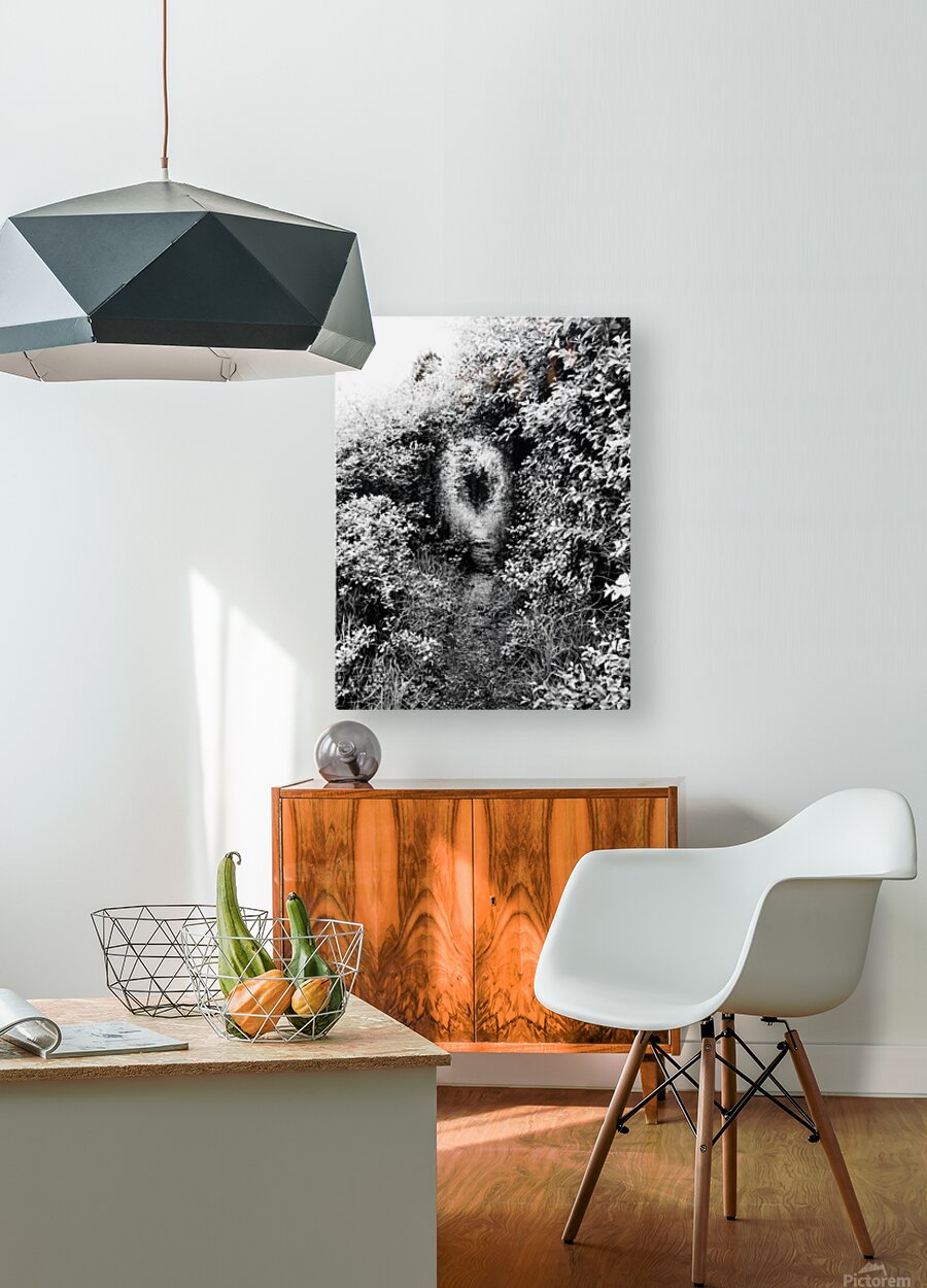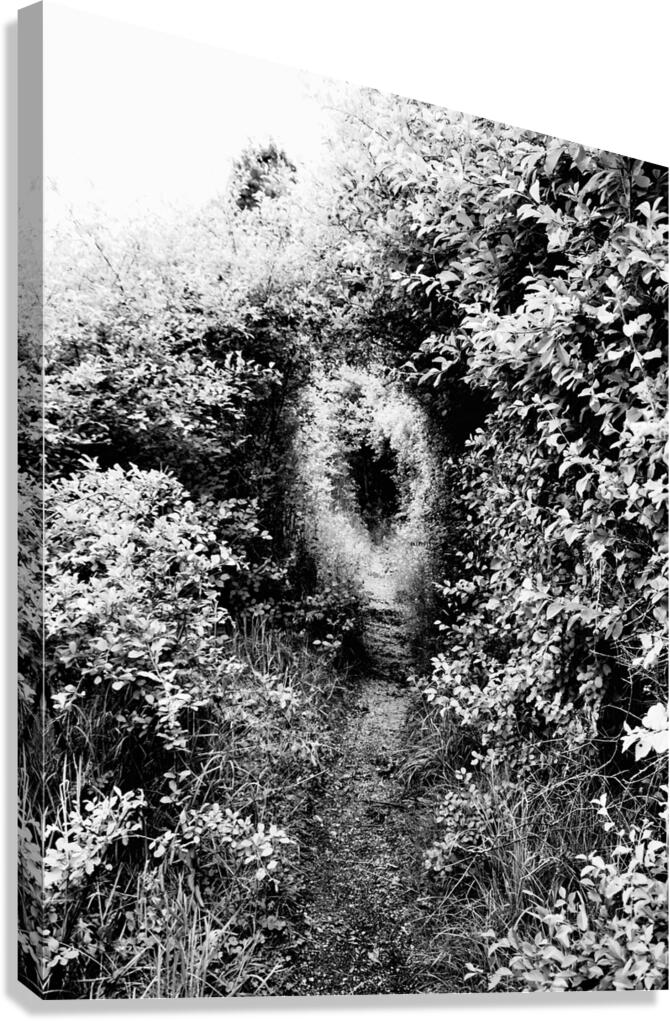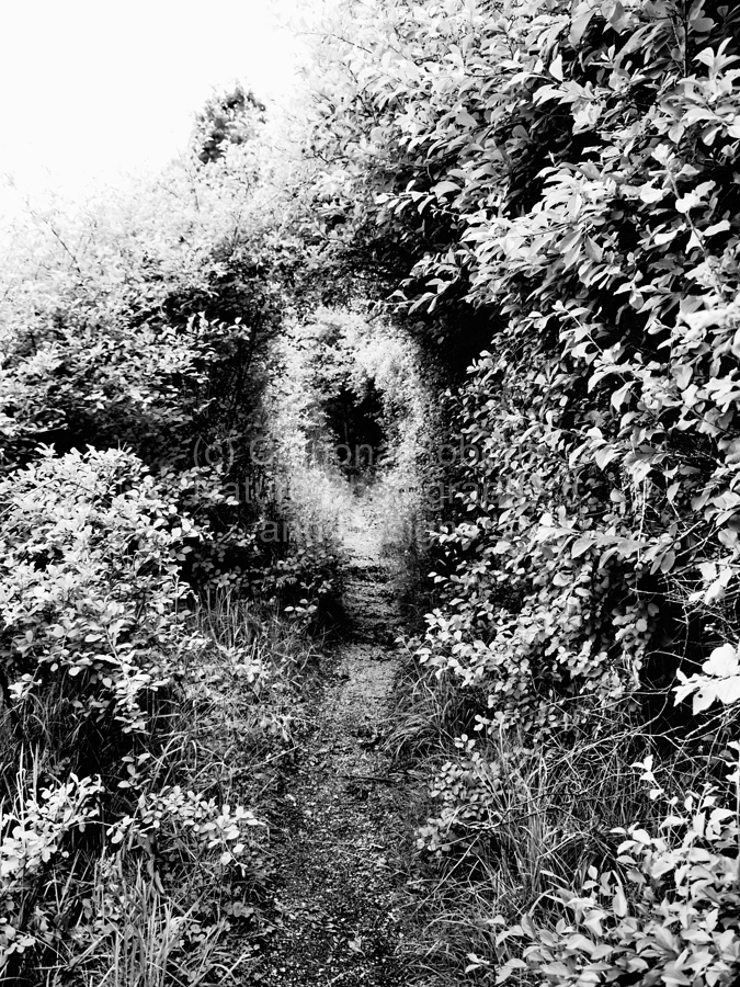 I took this photo during a lovely late spring nature walk through the Scottish Highlands. Features thick foliage lining a narrow dirt path that disappears into a sweeping archway formed naturally by the dense greenery. Shadows and textures create a mysterious, eerie atmosphere akin to a hidden entrance in a forest labyrinth.
