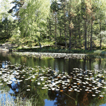 I took this photo during a lovely spring nature walk through the Scottish Highlands. Features a serene lochan surrounded by lush greenery, with numerous lily pads gently floating on the water's surface. Sunlight filters through the trees, casting dappled reflections on the pond and creating a tranquil atmosphere.