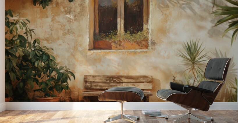 A bench in a Spanish courtyard full of potted plants, situated under a window, where lights and shadows mingle.